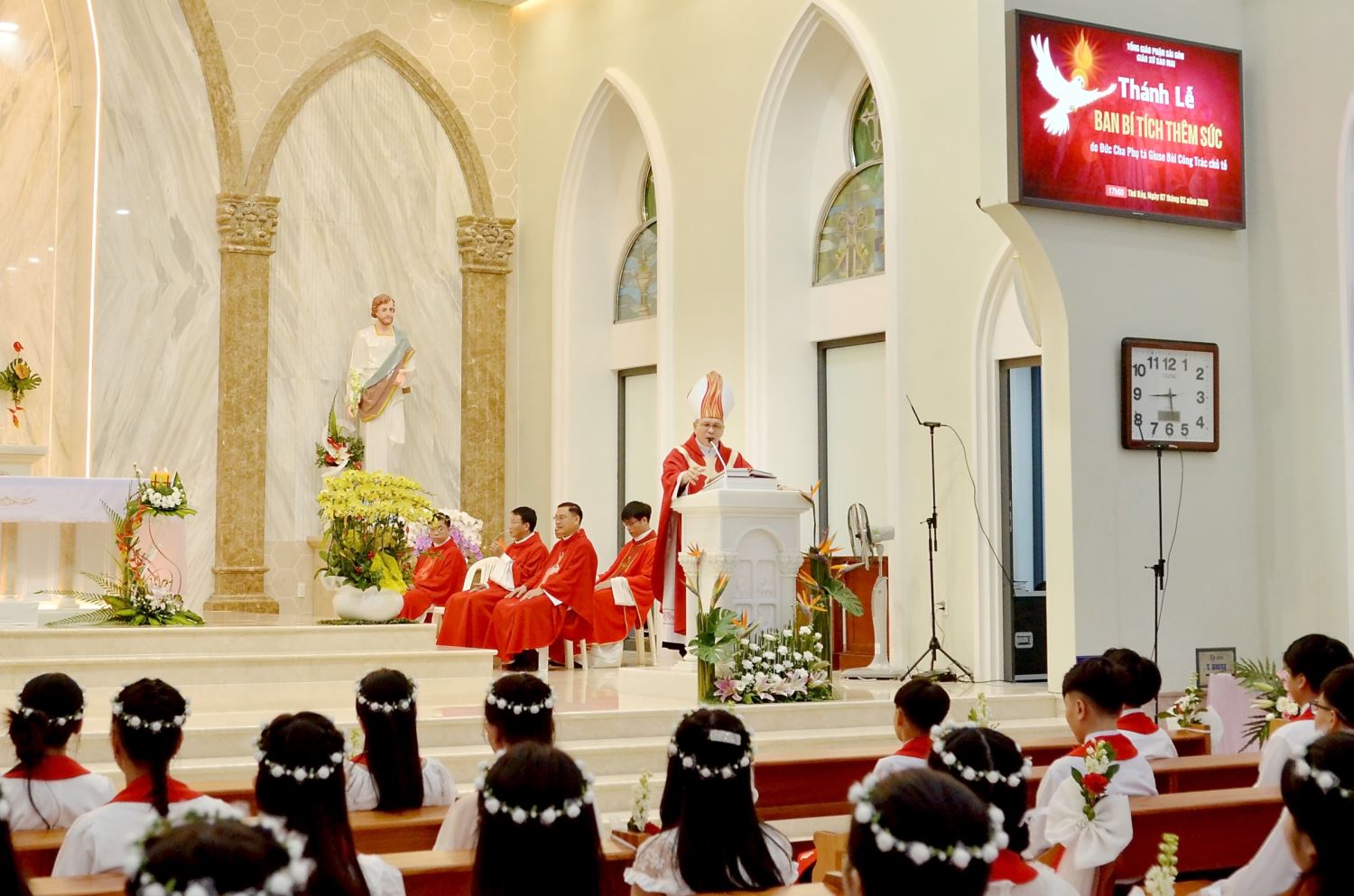 Sau bài giảng, Đức Giám mục Phụ tá Giuse đã cử hành nghi thức ban Bí tích Thêm Sức cho các em theo truyền thống của Hội Thánh: lặp lại lời tuyên xưng đức tin khi lãnh nhận Bí tích Thánh Tẩy, đặt tay cầu xin ơn Chúa Thánh Thần và xức dầu thánh trên trán. Lần lượt từng em thiếu nhi, cùng người đỡ đầu, tiến lên lãnh nhận ấn tín Chúa Thánh Thần.