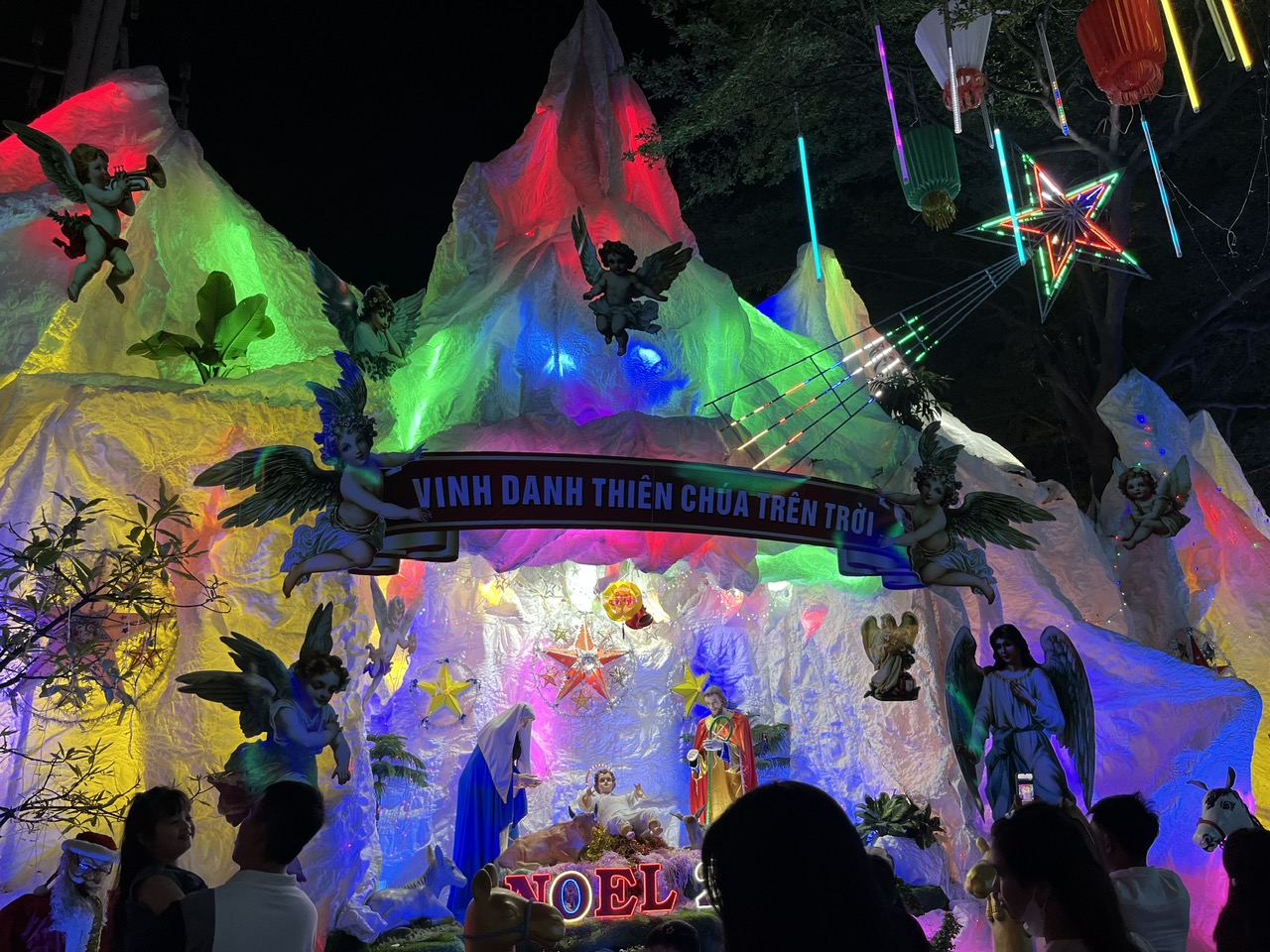 Tại khuôn viên nhà thờ Tân Đông, cây thông Noel bằng đèn led được đặt trang trọng giữa sân. Mặt tiền nhà thờ rực rỡ ánh sáng, hang đá Chúa Hài Đồng đã được hoàn thiện và bài trí trang nghiêm. Dù chưa đến ngày lễ chính, mỗi tối vẫn có đông đảo giáo dân và khách đến tham quan, chụp hình lưu niệm và cầu nguyện. Nhiều gia đình đưa con em đến nhà thờ, ghi lại những khoảnh khắc Giáng Sinh bên hang đá.