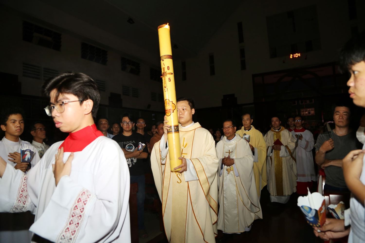 - Khi lần thứ hai, linh mục giương cao nến và đọc “Ánh Sáng Chúa Kitô”, thì lửa từ cây nến Phục Sinh lan truyên dần đến khắp cộng đoàn, bóng tối bị đẩy lùi, ánh sáng lan tỏa, cả nhà thờ bừng sáng. Chính ánh sáng của Đức Kitô làm cho chúng ta được sống.