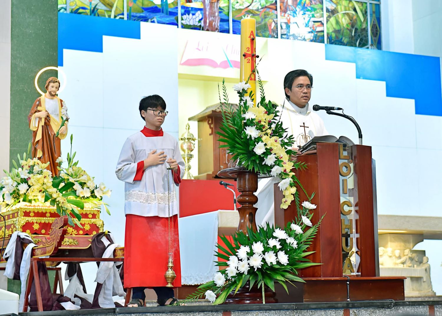 Trước khi xướng kinh Vinh Danh, Lm chánh xứ đã ngỏ lời: “Hôm nay, Giáo Hội mừng lễ Thánh Giuse và cũng là ngày quốc tế Lao động. Lễ này được Đức Giáo Hoàng Piô XII thiết lập vào ngày 1-5-1955, để thánh hóa ngày lao động. Trong ngày này, chúng ta được mời gọi nhìn vào tấm gương lao động của Thánh cả Giuse”. Lm chánh xứ cùng cộng đoàn chúc mừng giáo khu Giuse bằng những tràng pháo tay thật lớn.