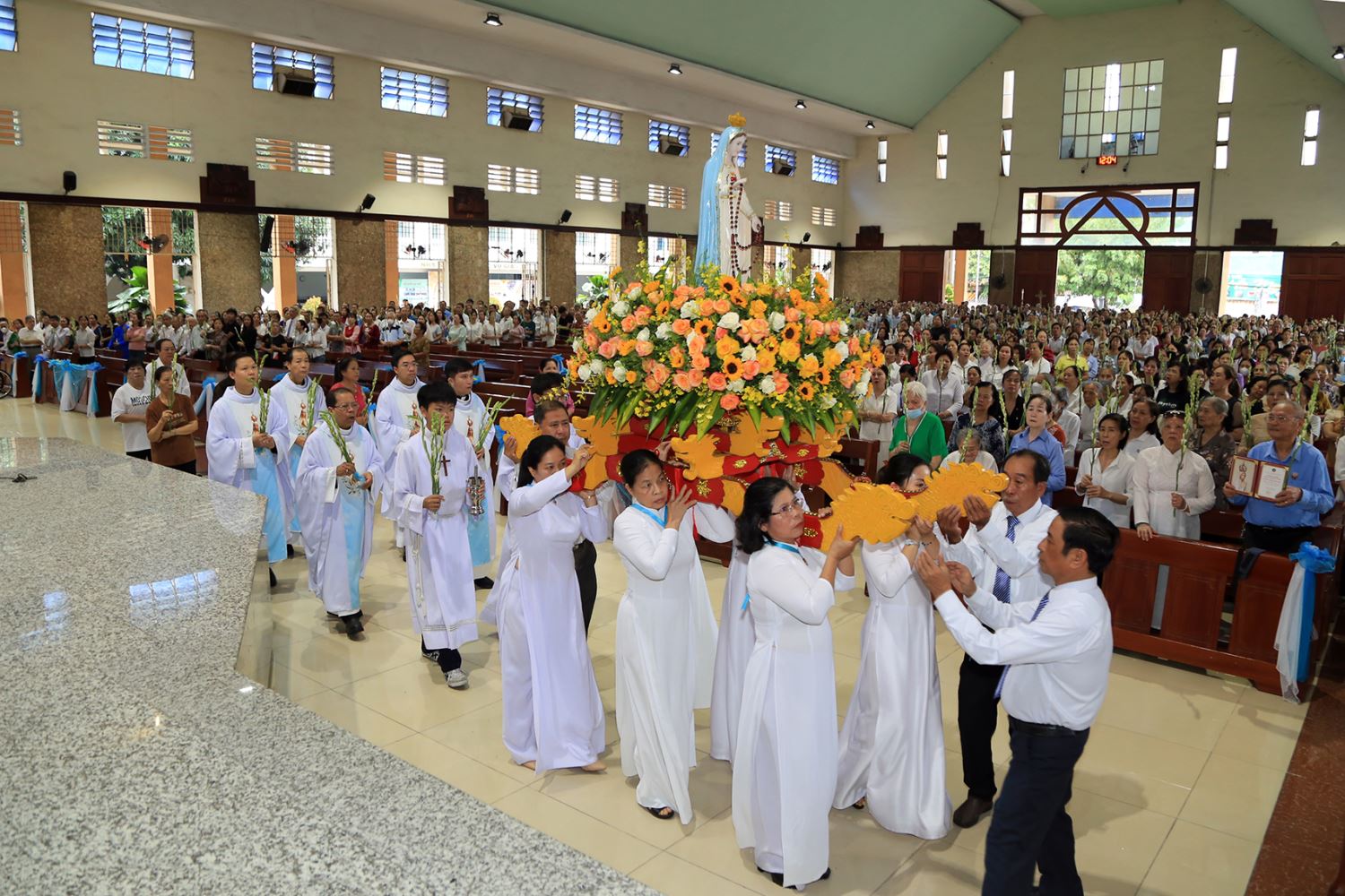 Trước Thánh lễ, cộng đoàn cùng linh mục chủ tế tham dự cuộc rước kiệu Đức Mẹ Fatima xung quanh khuôn viên nhà thờ. Trong lời dẫn vào Thánh lễ, cha Giuse Lê Hoàng nhắc nhớ cộng đoàn về ba mệnh lệnh Fatima mà Đức Mẹ đã trao gửi cho nhân loại: hãy ăn năn sám hối, tôn sùng Trái Tim Mẹ và siêng năng lần hạt Mân Côi.