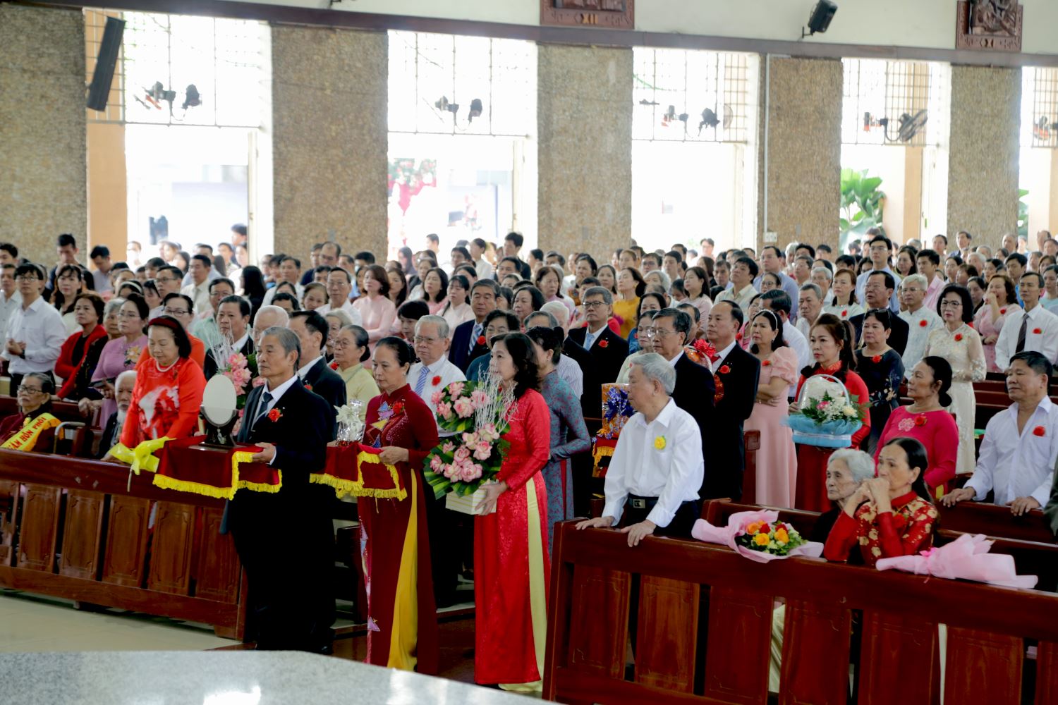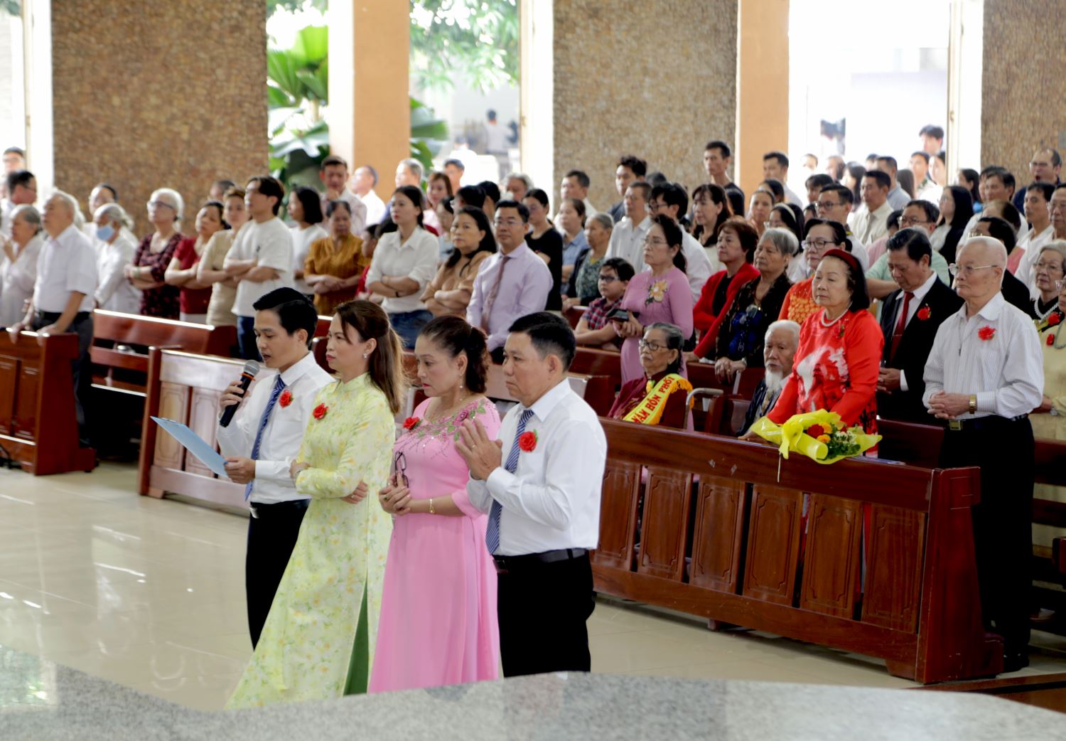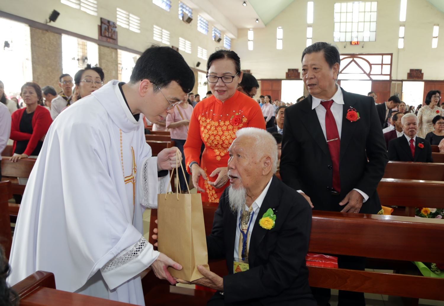 Từ lúc 9 giờ, các chị trong Hội Các Bà Mẹ Công giáo chào đón các đôi Hôn phối với những nụ hoa hồng cài trên áo cho các ông, đồng thời trao tặng bó hoa tươi thắm cho các bà. Lúc này, nhiều đôi Hôn phối đã có mặt tại nhà thờ. Một số cụ cao niên được con cháu dìu đi do sức khỏe hạn chế, nhưng trong lòng các cụ rất háo hức tạ ơn Chúa trong Lễ kỷ niệm đặc biệt này.