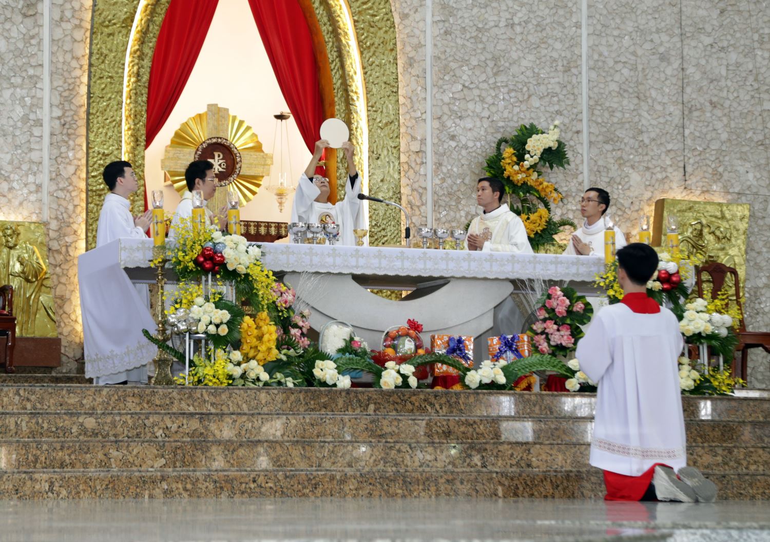 Lúc 9 giờ 30, các đôi Hôn phối đã rước đoàn đồng tế từ sảnh nhà thờ tiến lên cung thánh. Thánh lễ do linh mục Giuse Lê Hoàng chủ tế, đồng tế với ngài có các linh mục phó xứ: Gioan Lasan Đặng Thiên Quang, Giuse Vũ Hoàng Thanh, cùng các linh mục con của giáo xứ: Phêrô Mai Phi Hổ, Giuse Nguyễn Duy Hoàng, và linh mục Khoa (OP).