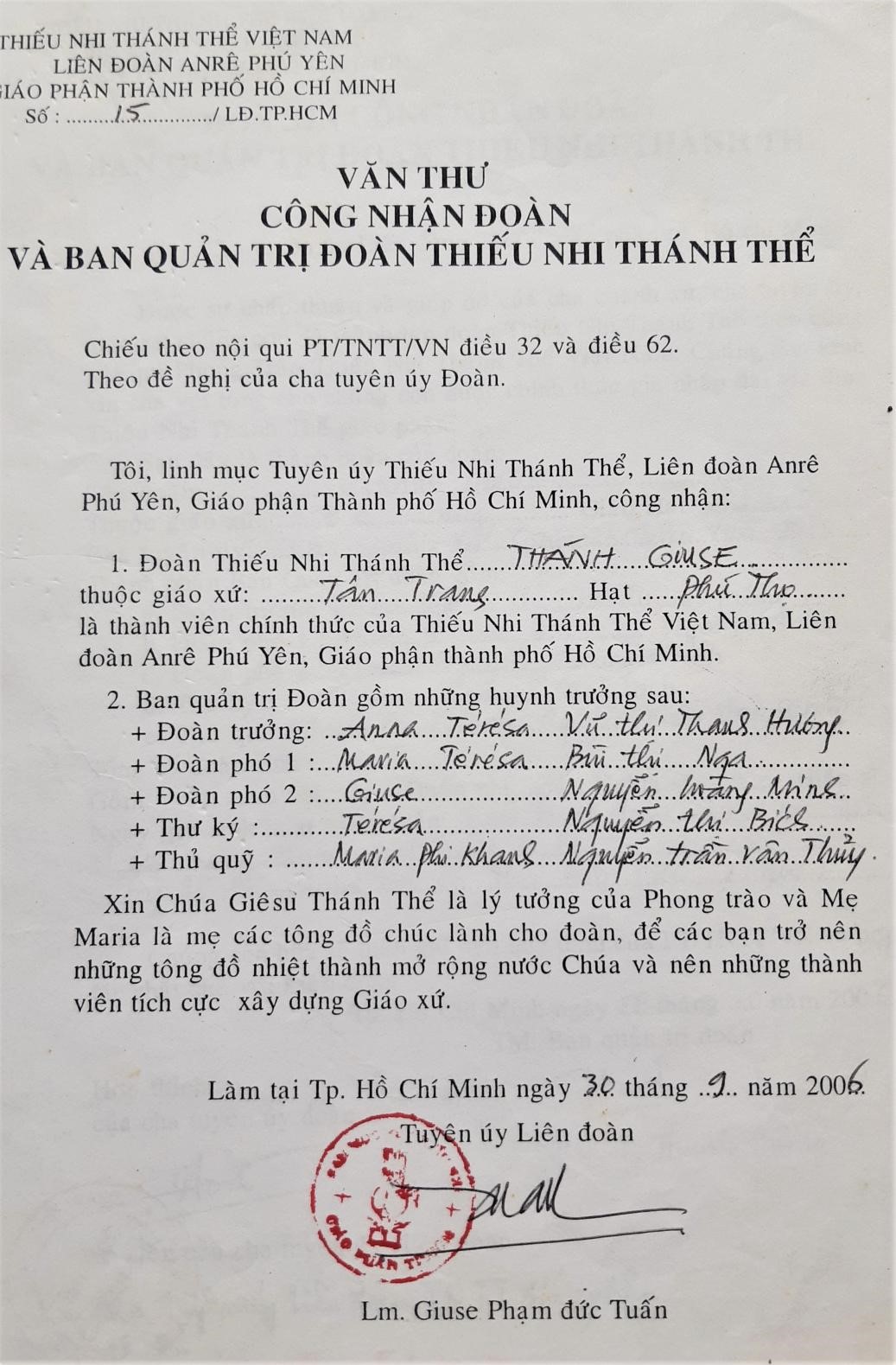 Đoàn TNTT xứ đoàn Thánh Giuse lại ra mắt theo công văn chính thức vào ngày lễ Truyền giáo 10.2006, được chị Trưởng HLV Maria Đỗ Tuyết Minh công bố.