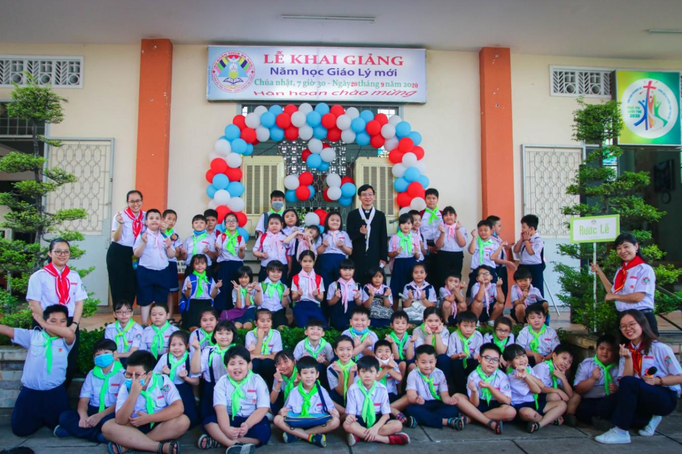 - 9g các em học giáo lý theo chương trình thăng tiến của Tổng Liên đoàn Thiếu nhi Thánh Thể (TNTT).
