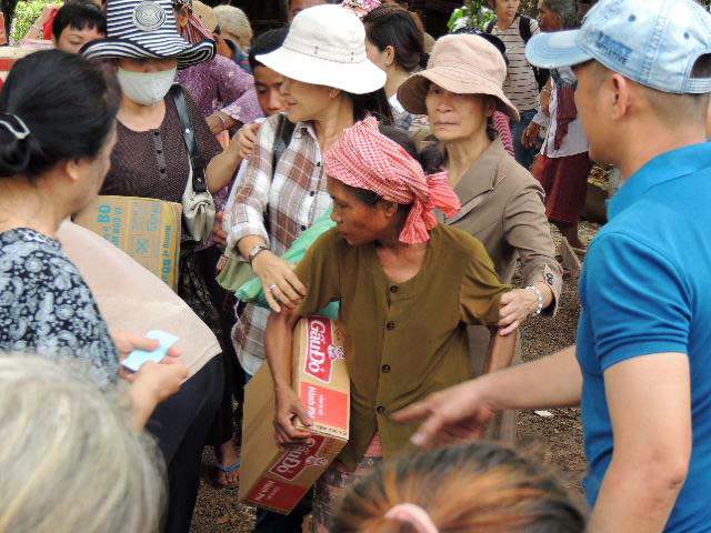 Anh chị em trong cộng đoàn mỗi người dắt một người đến nhận món quà sẻ chia của Lòng Chúa Thương Xót, gồm: 10 kg gạo, 1 thùng mì gói, 1 chai dầu ăn, 1 kg đường, 1 kg muối. Không khí bỗng trở nên náo nhiệt người qua kẻ lại, người ôm kẻ vác. Các anh chị em trong cộng đoàn vác đỡ những bao gạo, thùng mì cho những người già yếu ra tận cổng.