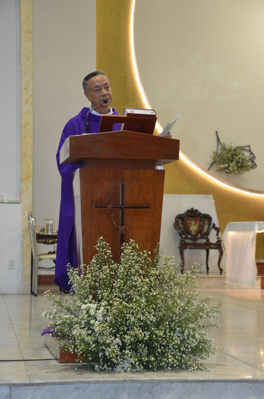 Trong bài giảng, Lm chủ tế chia sẻ: Đấng Cứu Thế đến thế gian không phải để ăn trên ngồi chốc nhưng đến để hy sinh phục vụ và hiến mạng sống mình trên cây thánh giá vì đoàn chiên, vì yêu thương nhân loại. Chính vì thế mà Chúa kêu gọi chúng ta nhìn lên cây Thập giá, đây là dấu chứng của tình yêu mà Thiên Chúa dành cho con người, không có tình yêu nào lớn hơn tình yêu của người dâng hiến mạng sống vì người mình yêu. Ngài ví mình như hạt lúa gieo vào lòng đất, hạt lúa có chết đi, có thối đi nó mới trổ sinh được nhiều bông hạt.