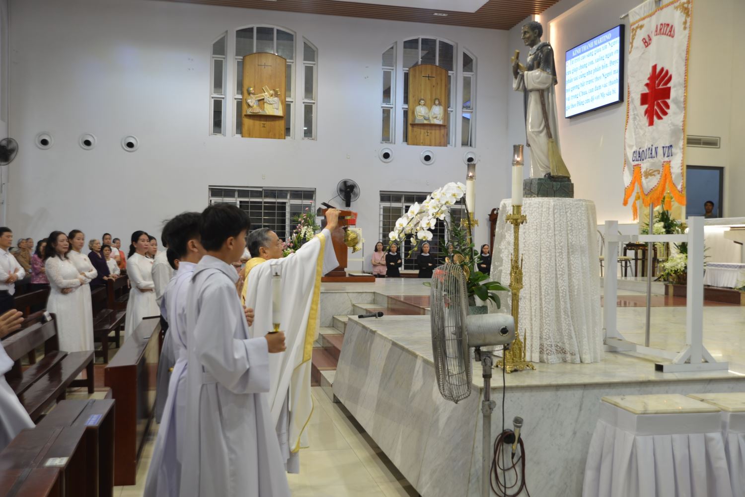 “Hôm nay, Giáo hội mừng kính Thánh Martinô - vị thánh da đen dòng Đa Minh, luôn phục vụ người nghèo với tấm lòng vàng. Đặc biệt, hôm nay cũng là ngày mừng bổn mạng của Ban Caritas và giáo khu Martinô. Chúng ta cùng tạ ơn Chúa và chúc mừng nhau.”