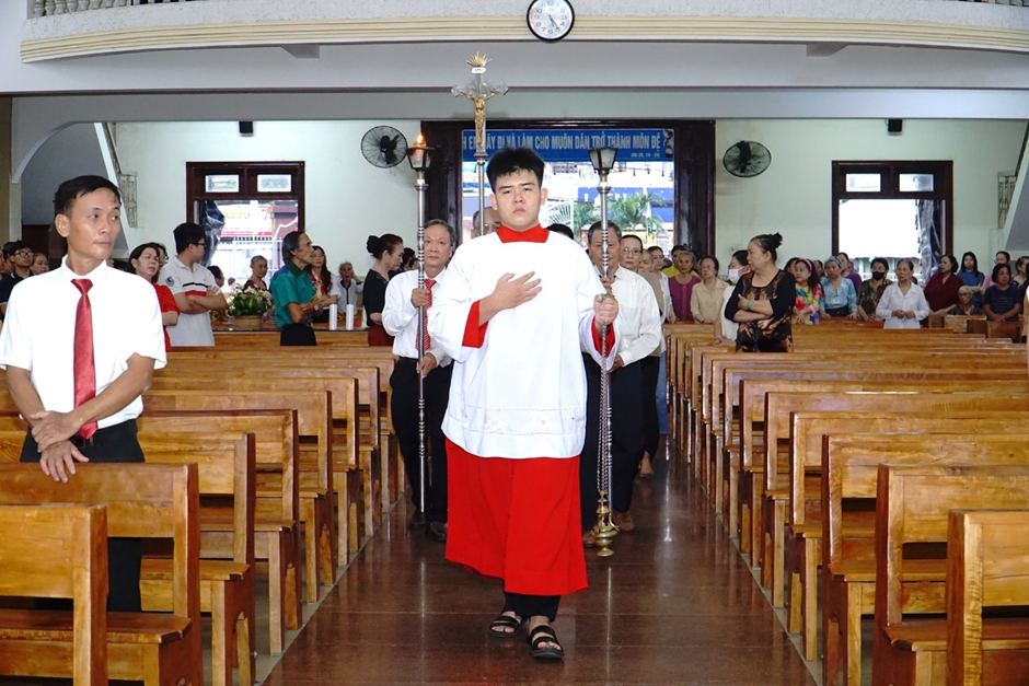 Thánh lễ được khởi sự với đoàn rước kiệu Thánh Gioan chung quanh khuôn viên nhà thờ, tiến vào cung thánh trong bầu khí trang nghiêm và sốt sắng.