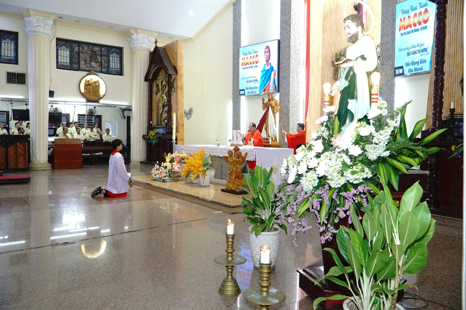 Trong bài giảng, linh mục Giuse chia sẻ: Thánh Marcô tuy không thuộc nhóm Mười Hai, nhưng là người cộng tác đắc lực với các tông đồ, đặc biệt là thánh Phêrô. Ngài đã ghi lại Tin Mừng cách ngắn gọn, súc tích nhưng đầy sức mạnh, làm nổi bật các hành động của Chúa Giêsu. Từ đó, mỗi người được mời gọi ý thức rằng ai cũng có thể trở thành người loan báo Tin Mừng, nếu biết cộng tác với ơn Chúa.