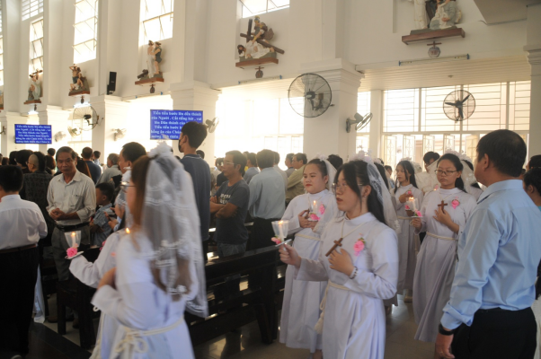 Các em rước lễ lần đầu và rước lễ trọng lễ đã lần lượt tiến lên lên lãnh nhận Bí tích Thánh Thể một cách trang nghiêm và cung kính.
