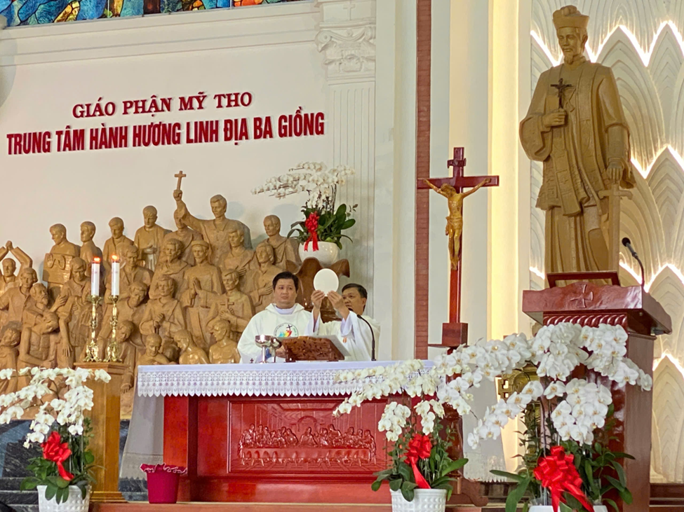 Linh mục Giuse Vũ Minh Thùy, Chánh xứ Thánh Linh, nhắn nhủ cộng đoàn khi chủ tế Thánh lễ Hành hương tại Trung tâm Hành hương Ba Giồng, Giáo phận Mỹ Tho, nơi ghi dấu chứng tá của nhiều Thánh Tử Đạo Việt Nam. Đồng tế với ngài có linh mục Anphongsô Nguyễn Minh Tân cùng đông đảo giáo dân giáo xứ Thánh Linh.