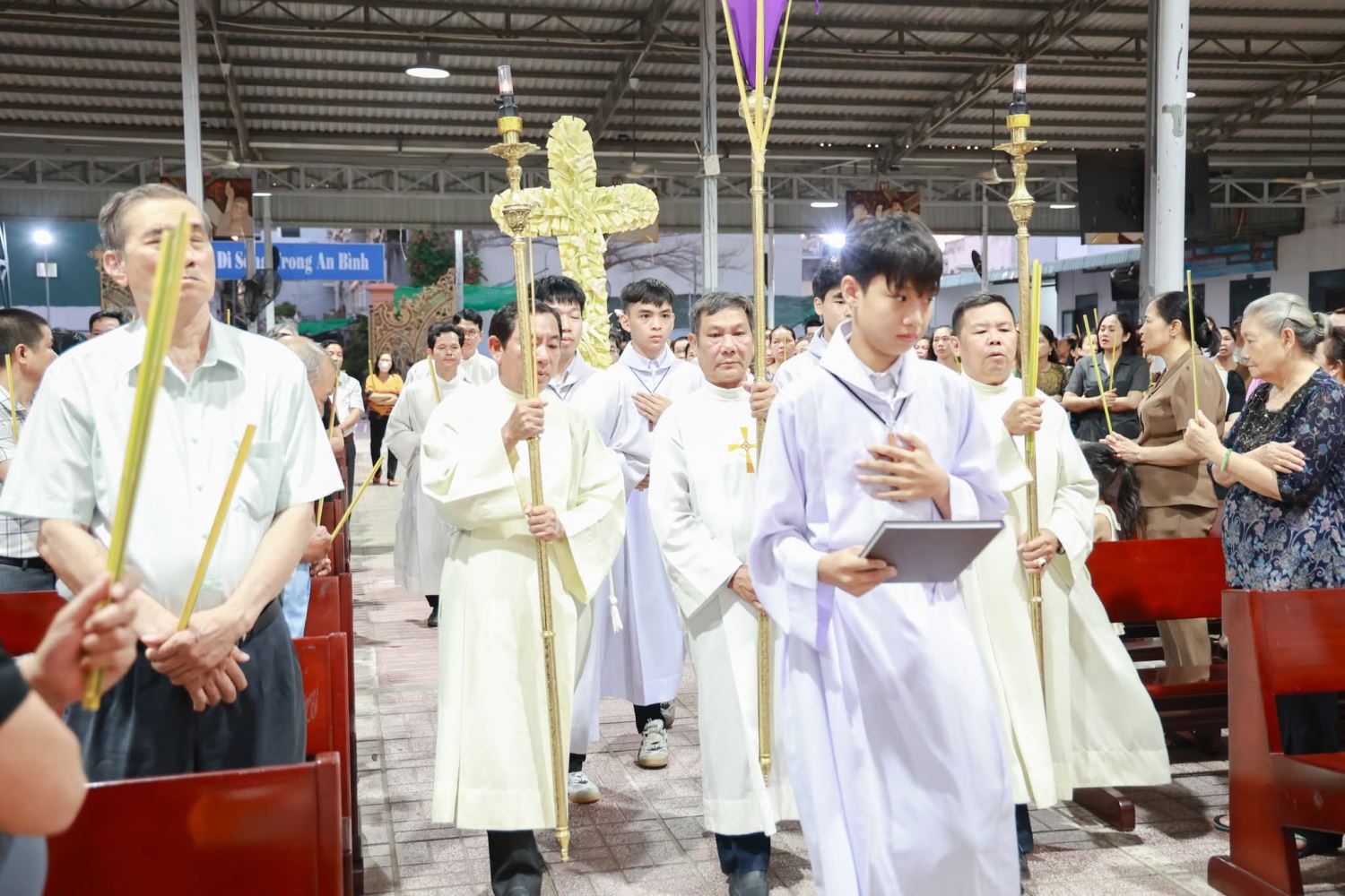 Trước Thánh lễ, linh mục Giuse cùng cộng đoàn cử hành nghi thức làm phép lá tại khuôn viên nhà thờ. Sau đó, trong bầu khí trang nghiêm và sốt sắng, đoàn rước tiến vào thánh đường với những cành lá trên tay, hòa cùng ca nhập lễ, tưởng niệm biến cố Chúa Giêsu khải hoàn vào thành Giêrusalem.