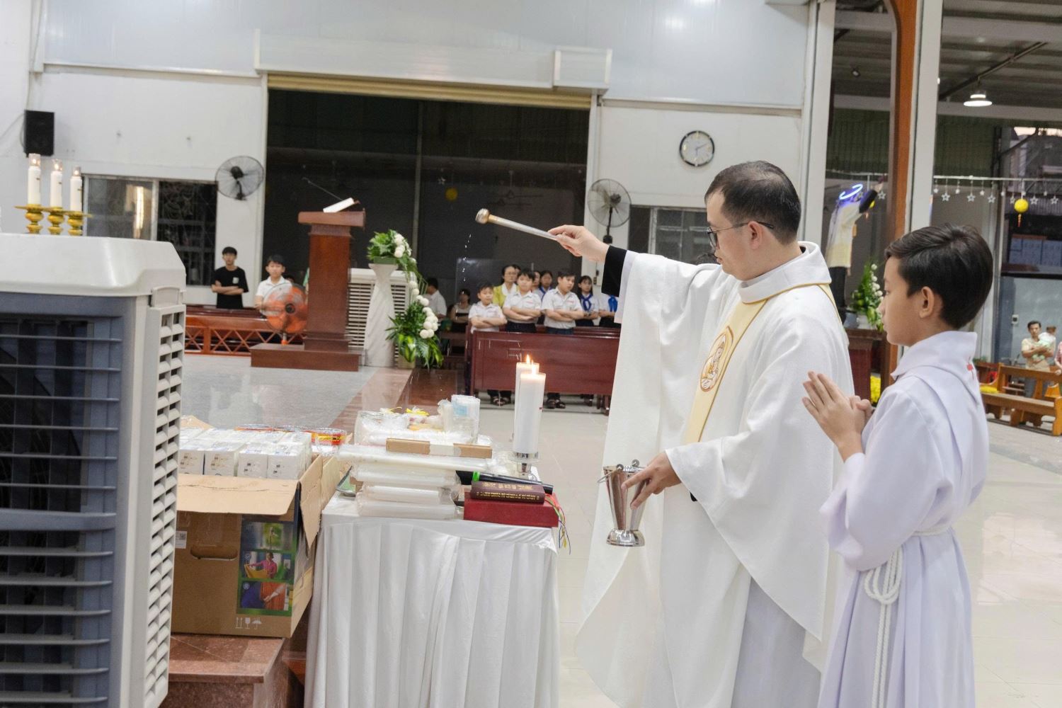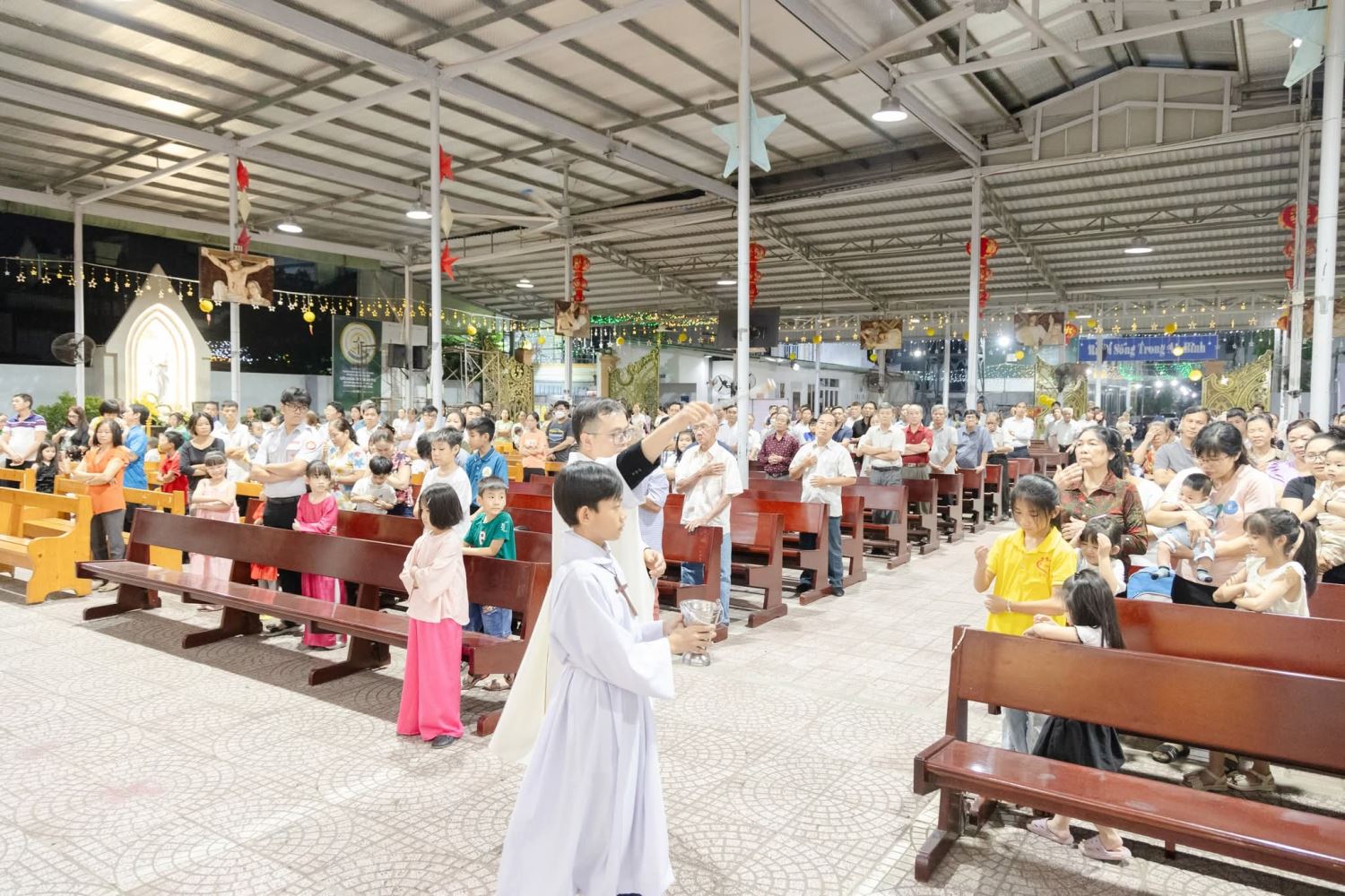 Sau bài giảng, Lm chủ tế đã cử hành nghi thức rảy nước thánh trên các em thiếu nhi và cộng đoàn hiện diện, như lời nhắc nhở mỗi người hãy luôn ghi nhớ tình yêu, sự che chở và lời mời gọi sống thánh thiện của Thiên Chúa. Các em nhỏ tỏ ra rất háo hức khi xếp hàng chờ được cha ban phép lành.