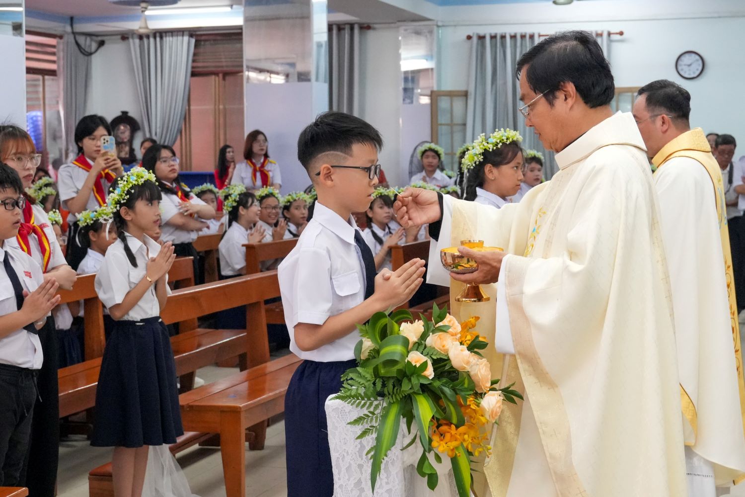 Trong phần hiệp lễ, các em thiếu nhi đã được rước Chúa trong niềm hân hoan, hạnh phúc đầy tràn vì lần đầu được Chúa ngự đến viếng thăm tâm hồn.