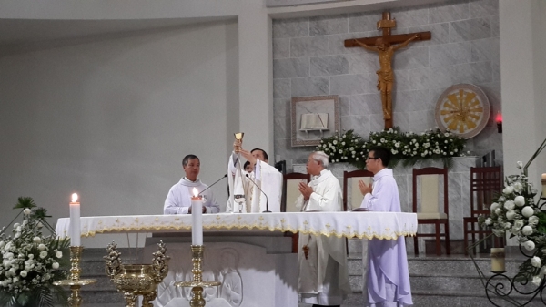 Hoà trong những tâm tình đó, Đức cha chủ tế, cha chính xứ Thiên Thần cùng quý cha Dòng Tên, quý tu sĩ nam nữ và cộng đoàn dâng Chúa đã cùng sốt sắng hiệp dâng Thánh lễ tạ ơn này.