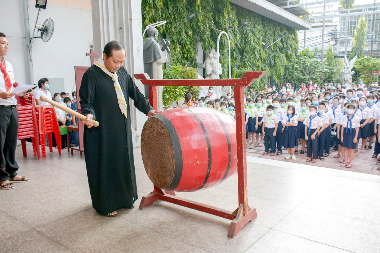 Mở đầu là nghi thức chào cờ, diễn ra ngay trước sân nhà thờ, với bài hát “Thiếu nhi Tân hành ca". Kế đó, Lm chánh xứ Gioakim đã đánh ba hồi trống như thúc giục các em bước vào năm học Giáo lý mới với tinh thần hăng say, hứng khởi và với niềm hy vọng tràn đầy.
