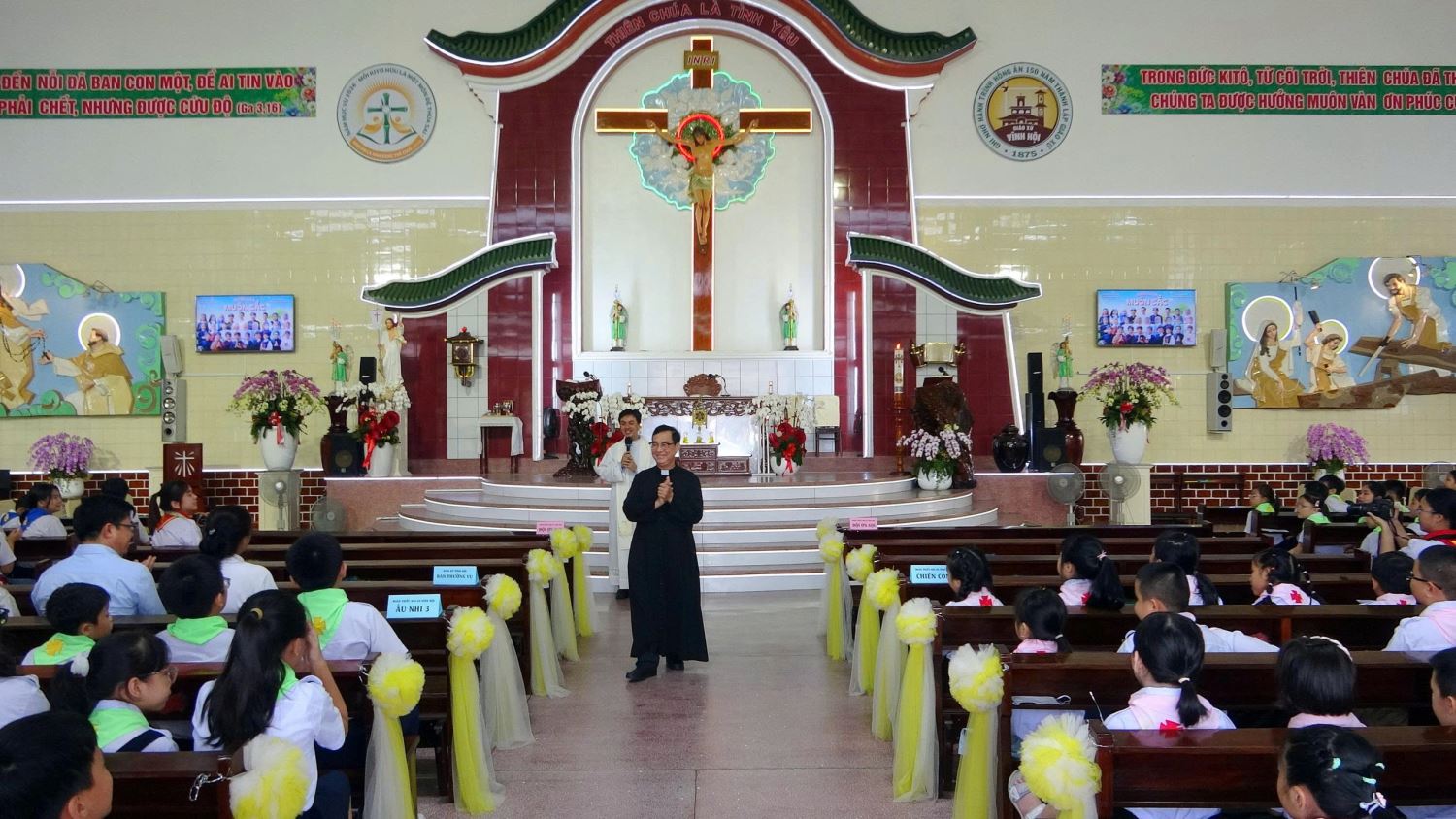 Linh mục phó xứ Anphôngsô ví các linh mục, tu sĩ như những “bông hoa tỏa hương” trong lòng Giáo Hội, đồng thời khích lệ các em biết lắng nghe và nhận ra tiếng gọi riêng của mình. Bầu khí ngày hội trở nên sôi động khi cộng đoàn cùng hô vang khẩu hiệu, khơi dậy tinh thần hăng say nơi các em thiếu nhi.
