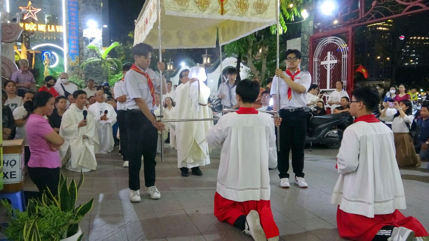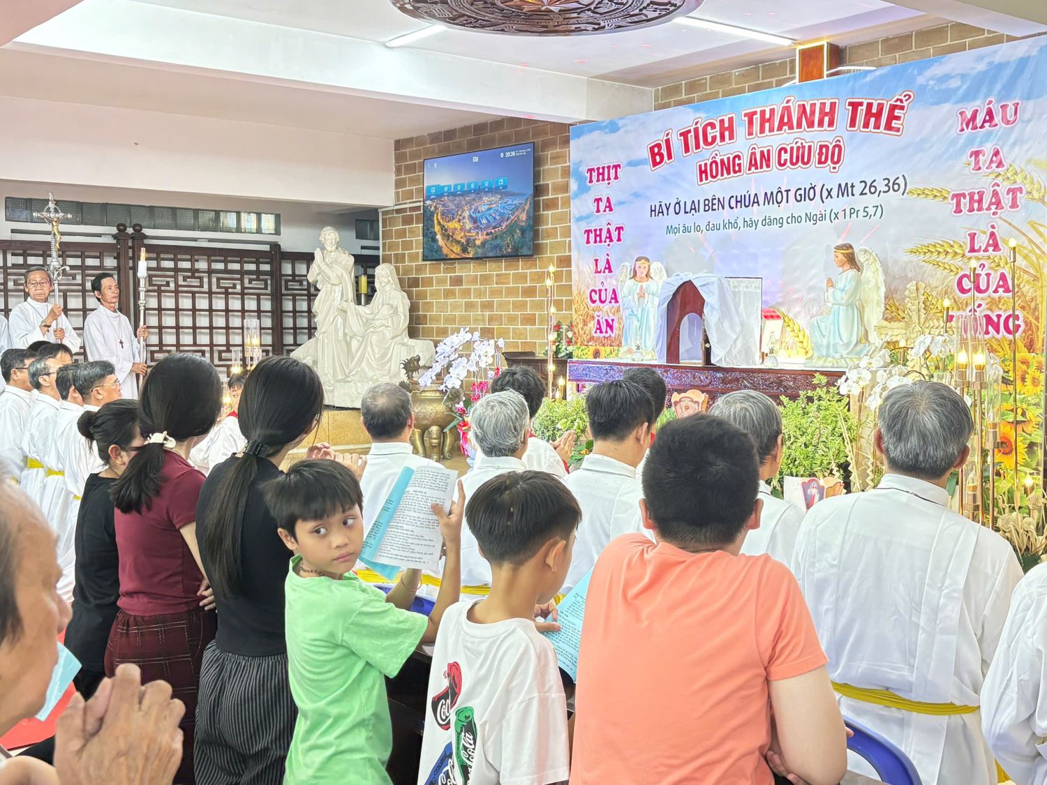 Khi đoàn rước tiến đến nơi, linh mục Anphongsô cất lên thánh thi Tantum Ergo - bài ca ngàn năm của Hội Thánh dâng lên trước Mình Thánh Chúa, đưa cộng đoàn hòa vào truyền thống phụng vụ lâu đời mà hôm nay giáo xứ Vĩnh Hội cũng được trở nên một phần.