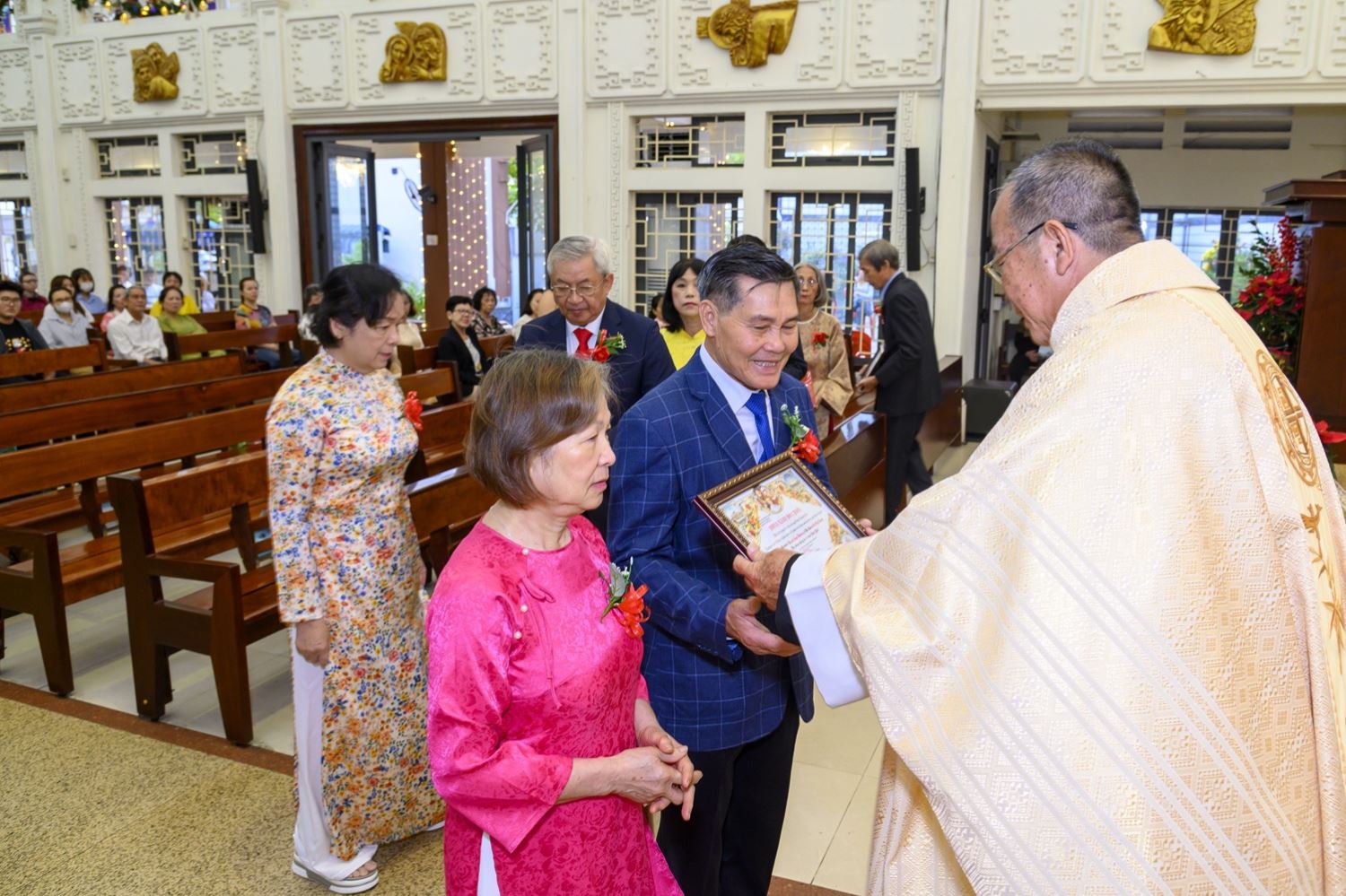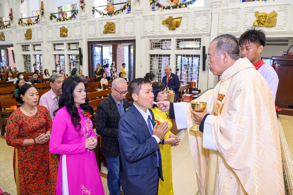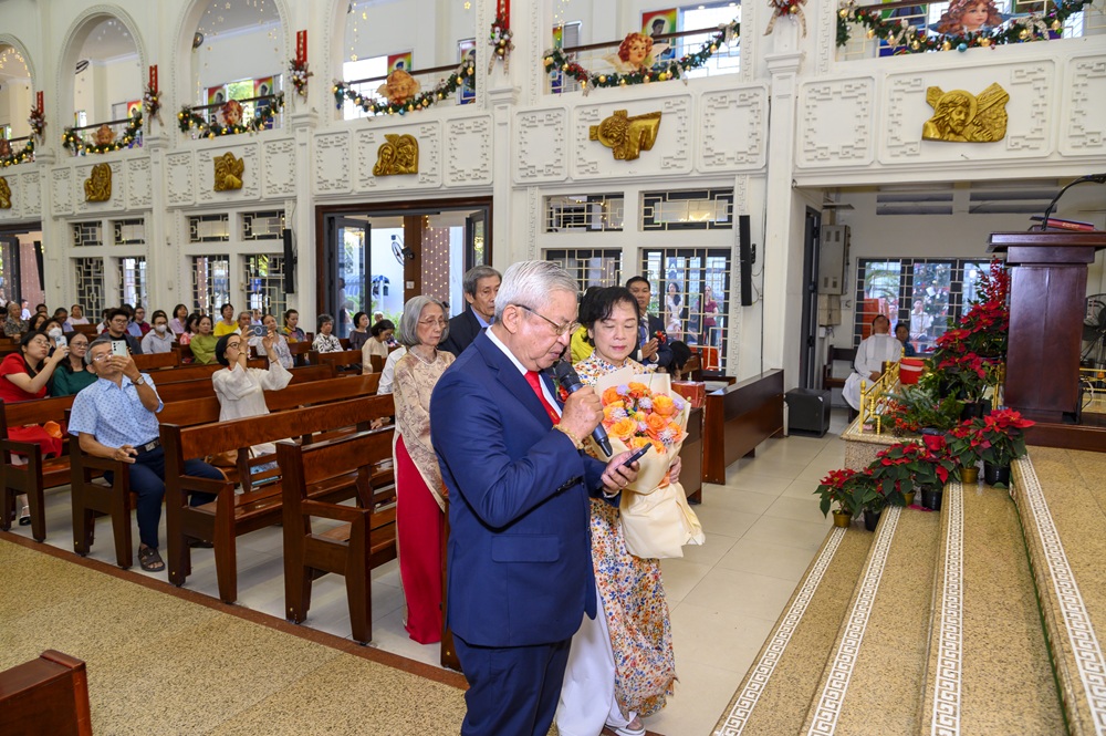 Trước Thánh lễ, linh mục chủ tế đã chúc mừng và chủ sự nghi thức rước từ cuối nhà thờ dành cho 06 đôi hôn phối, kỷ niệm 30, 40 và 50 năm chung sống trong ân sủng Bí tích Hôn phối.