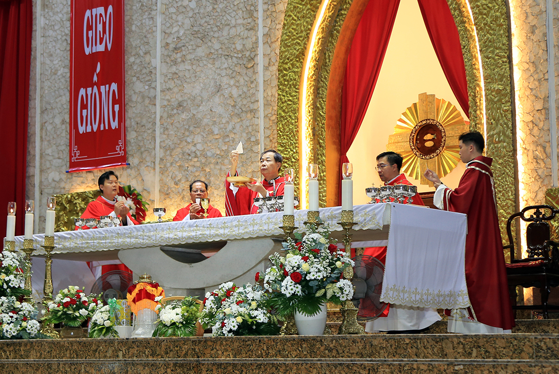 Chủ sự thánh lễ là Lm Chánh xứ Giuse Lê Hoàng. Đồng tế có 3 Lm phó: Giuse Vũ Hoàng Thanh, Micae Hoàng Hồng Hải và Vinh Sơn Vũ Đức Trọng và Lm Gioan Lasan Mai Thiên Quang (Dòng Mẹ Cứu Chuộc)