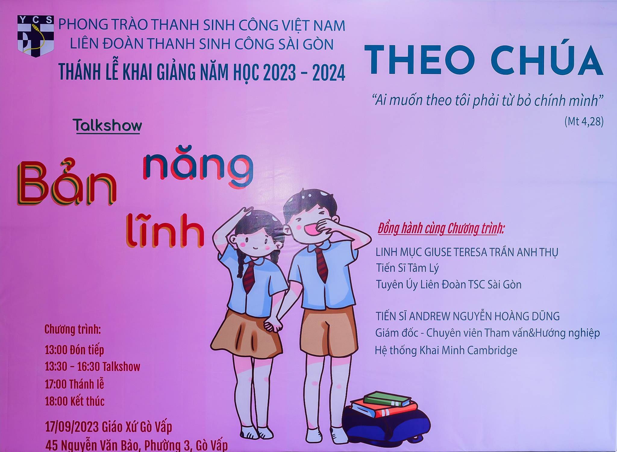 Thánh lễ khai giảng năm học 2023-2024 với chủ đề “Theo Chúa” được Liên Đoàn Thanh Sinh Công Sài Gòn tổ chức lúc 13h00 ngày Chúa nhật 17-09-2023 tại giáo xứ Gò Vấp. Hiện diện trong buổi lễ có Linh mục (Lm) Giuse Têrêsa Trần Anh Thụ, Trưởng ban Học sinh - Sinh viên của Uỷ ban Giáo dục thuộc Hội Đồng Giám Mục Việt Nam và là Tuyên Uý Liên đoàn Thanh Sinh Công (TSC) Sài Gòn.