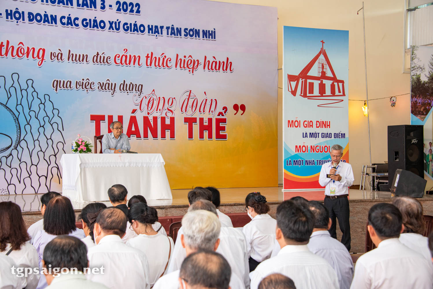 Lm Phêrô gợi ý về đề tài: “Củng cố mối hiệp thông và hun đúc cảm thức hiệp hành qua việc xây dựng cộng đoàn Thánh Thể”. Lm giải thích cụ thể “Cộng đoàn Thánh Thể là cộng đoàn tham dự Thánh lễ Chúa nhật và hằng ngày”; Giáo hội/ giáo xứ là ngôi nhà và là ngôi trường người tín hữu Hiệp hành: Hiệp thông - Tham gia - Sứ vụ; Thánh lễ là nơi để chúng ta học hỏi hữu hiệu và sống động nhất. Ngài mong các quý chức trong các nhóm đã được phân chia đào sâu, chia sẻ những kinh nghiệm theo đề tài trên để từ đó dẫn đến việc hiệp hành xây dựng giáo xứ ngày một tốt đẹp như Chúa mong ước.