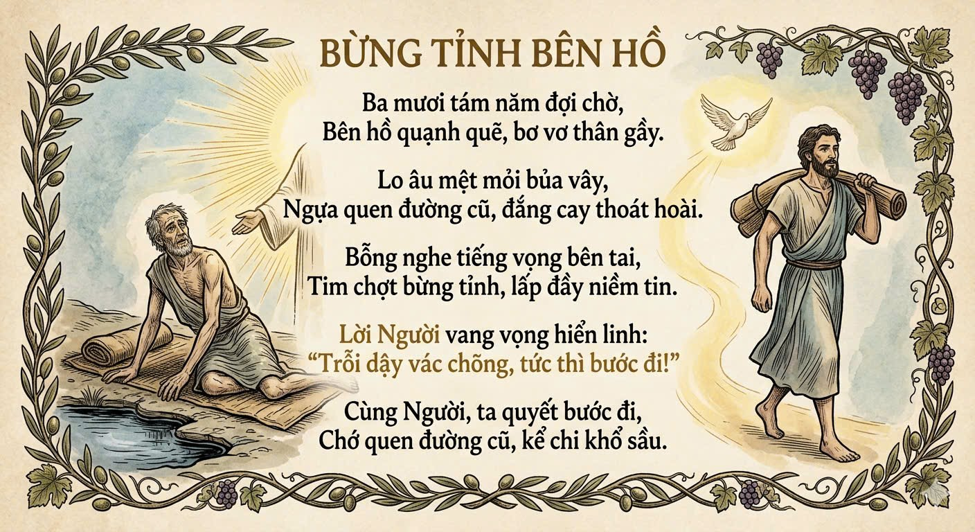 Nhiều khi chúng ta cũng giống người bại liệt ấy. Ta quen với những yếu đuối của mình, quen với những lần thất bại, quen với việc trì hoãn hoán cải. Dần dần, ta sống trong tình trạng “ngủ mê thiêng liêng” không còn khao khát đứng lên, không còn tin rằng đời mình có thể đổi thay. Nhưng Mùa Chay là thời gian Chúa đến gần và hỏi mỗi người: Bạn có thật sự muốn được chữa lành không?