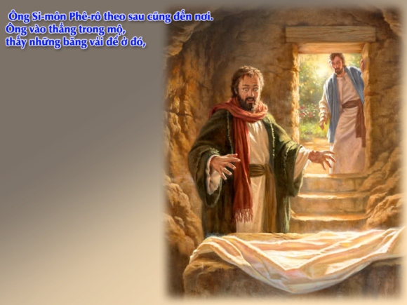 - Các Tông đồ không tin câu chuyện do các bà kể (Lc 24,11.23) vì họ đánh giá thấp lời làm chứng của các phụ nữ. Họ coi đó là chuyện vớ vẩn. Sau đó Phêrô đã chạy ra mộ để kiểm chứng. Khi không thấy xác Thầy mà chỉ thấy những băng vải liệm còn để lại, ông kinh ngạc trước những điều lạ lùng đó. Kinh ngạc đôi khi có nghĩa tiêu cực trong Tin Mừng Luca (Lc 11,38; x. Cv 13,41), nhưng đa phần mang nghĩa tích cực (Đọc Lc 1,21.63; 2,18.33; 4,22; 8,25; 11,14; 20,26). Tuy nhiên, Phêrô chỉ kinh ngạc chứ không đi loan báo Tin Mừng phục sinh cho các anh em khác.