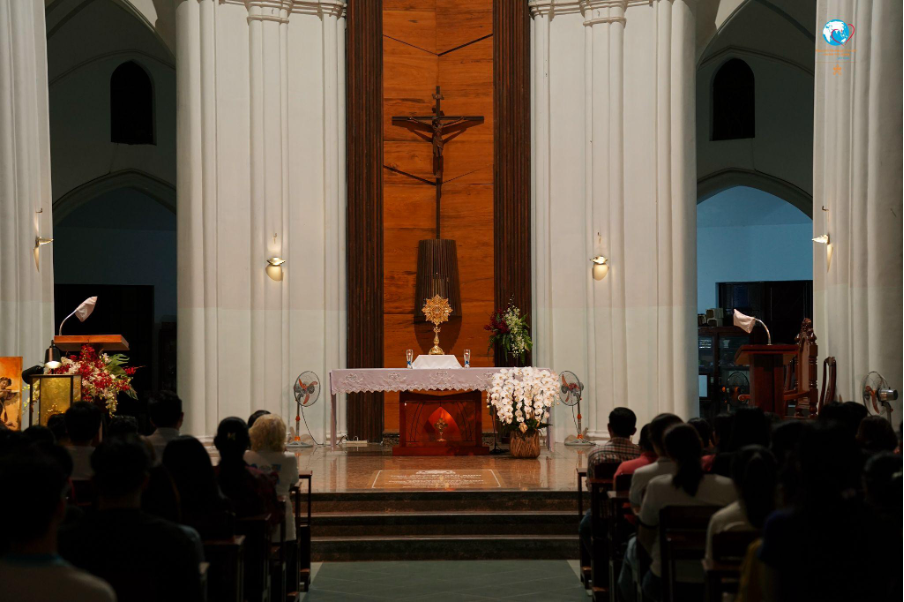 Tối 16.10.2025, trong bầu khí sốt mến và đầy tươi vui của Triển lãm Phép lạ Thánh Thể trên thế giới do Thánh Carlo Acutis sưu tầm và biên soạn – cộng đoàn dân Chúa đã cùng nhau tham dự giờ Chầu Thánh Thể chung tại Nhà nguyện cổ Trung tâm Mục vụ TGP. Sài Gòn, do cha Tôma Vũ Ngọc Tín, S.J., Giám đốc Mạng lưới Cầu nguyện Toàn cầu của Đức Giáo hoàng tại Việt Nam, chủ sự. Ca đoàn Lumen đảm trách phần phụng vụ thánh nhạc, góp phần nâng tâm hồn cộng đoàn lên với Chúa Giêsu Thánh Thể.