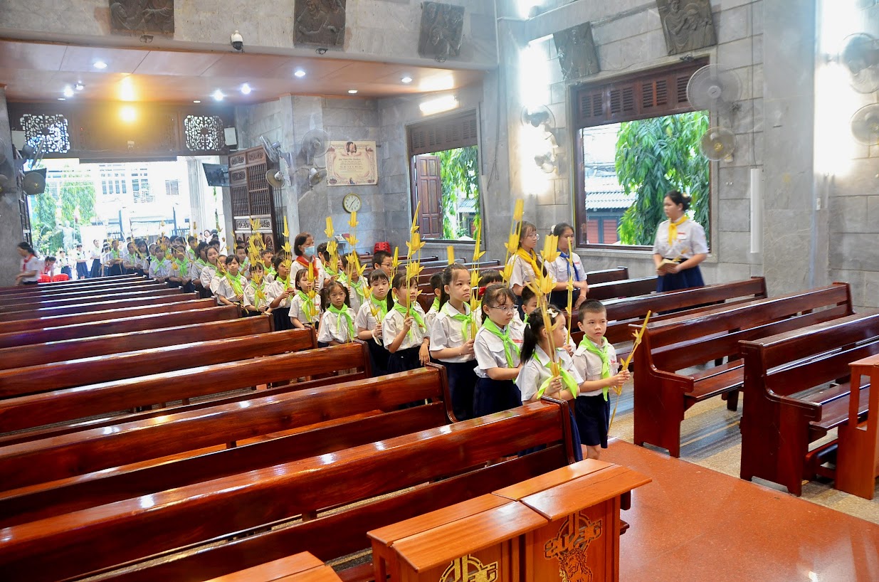 Trước Thánh lễ, linh mục Barnaba Maria cùng cộng đoàn cử hành nghi thức làm phép lá ngay trước tiền sảnh nhà thờ. Sau đó, linh mục chủ tế, thầy Phó tế Giuse Nguyễn Văn Cương, Dòng Ngôi Lời cùng các em thiếu nhi cầm cành lá trên tay, tiến vào thánh đường trong niềm hân hoan.