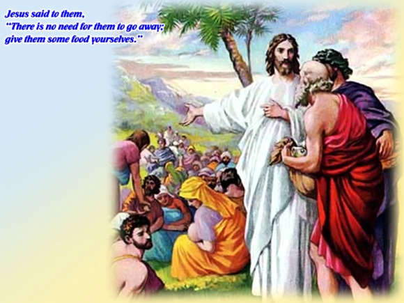 Bánh và cá hóa ra nhiều để nuôi dân chúng, đồng thời phép lạ diễn ra vào buổi chiều làm cho ta liên tưởng đến bữa tiệc ly, khi Chúa Giêsu và các môn đệ ăn lễ Vượt Qua, Chúa Giêsu đã cầm lấy bánh và rượu , tạ ơn Thiên Chúa Cha, rồi phân phát cho các môn đệ. Ở đây, Chúa Giêsu đã xin các môn đệ làm lại cử chỉ của Chúa Giêsu để tưởng nhớ đến Ngài. Ðộng từ “trao cho”, được Chúa dùng để nói đến sứ vụ của Ngài là trao ban, rồi qua tay các môn đệ , các tông đồ, các linh mục động từ trao ban cũng được các Ngài dùng để phân phát cho những người khác. Và, do đó lịnh truyền của Chúa cho các môn đệ: “Các con hãy cho họ ăn” luôn là sứ mạng thôi thúc các sứ giả của Chúa. Chúa luôn mời gọi con người chia sẻ cho nhau không những của cải vật chất mà còn chia sẻ cho nhau bằng chính lời cầu nguyện và hiệp thông nhau nơi Bí tích Thánh Thể.