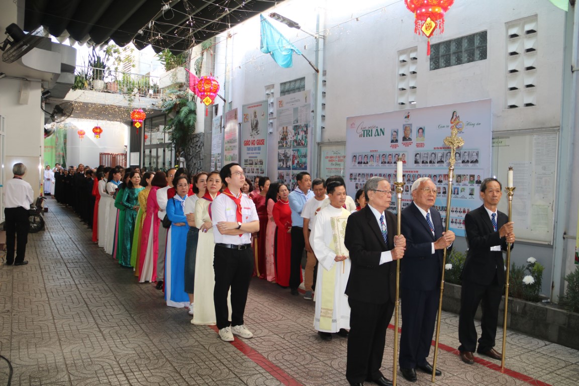 Khởi đầu là lời dẫn lễ về quá trình hình thành giáo xứ. Sau đó, đoàn đồng tế tiến vào nhà thờ trong tiếng hoan ca tạ ơn 70 năm của ca đoàn giáo xứ, đã làm cho cộng đoàn thêm lòng tin yêu kính mến Thiên Chúa.