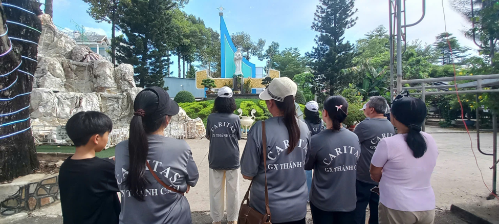 Trưa thứ Sáu, ngày 12.12.2025, lúc 13g30, toàn thể anh chị em thành viên và cộng tác viên Caritas cùng các em Thiếu nhi Thánh Thể tập trung tại tượng đài Đức Mẹ. Trong bầu khí sốt sắng, mọi người cùng đọc kinh, xin ơn bình an và dâng chuyến đi trong tay Chúa trước khi khởi hành.