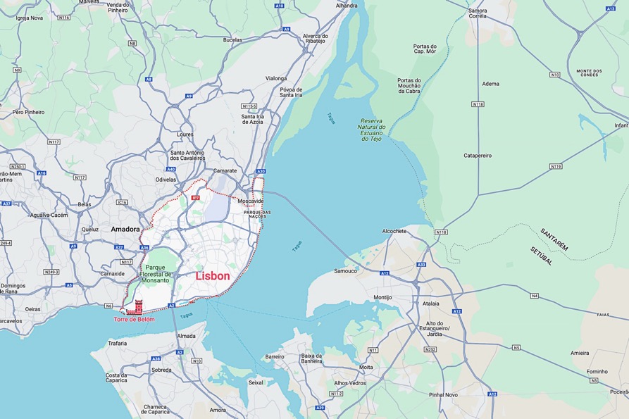 Bản đồ Lisbon, vị trí hải cảng Praia do Restelo còn di tích tháp Bélem (Torre de Bélem)