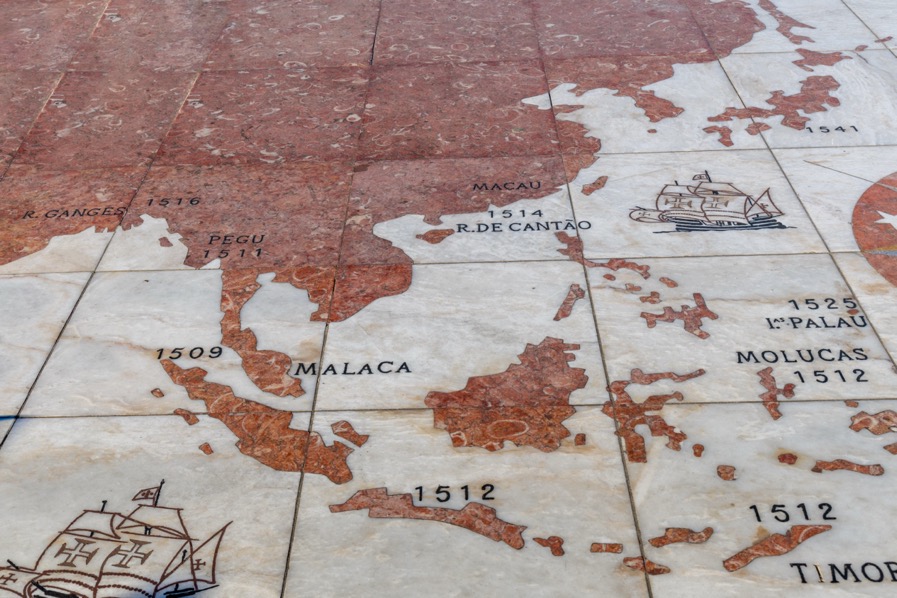 Sân quảng trường có một bản đồ thế giới ghi các nơi và năm các nhà thám hiểm và thương thuyền Bồ Đào Nha đi đến ở thế kỷ thứ 15, 16…