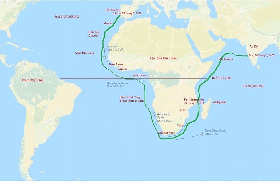 Bản đồ hải trình của các thương thuyền Bồ Đào Nha từ cảng Praia do Restelo đến Goa - Ấn Độ, từ đó các vị thừa sai đi tiếp đến Ma Cao