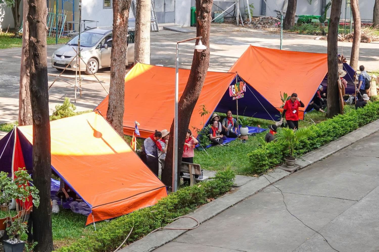 Tiếp theo là bài khóa “Dựng lều” – mái nhà chung của đội trong ba ngày sa mạc – không chỉ vững chắc mà còn được các SMS thiết kế bàn thờ trang trọng và trang trí lều phù hợp với tên thánh của đội.