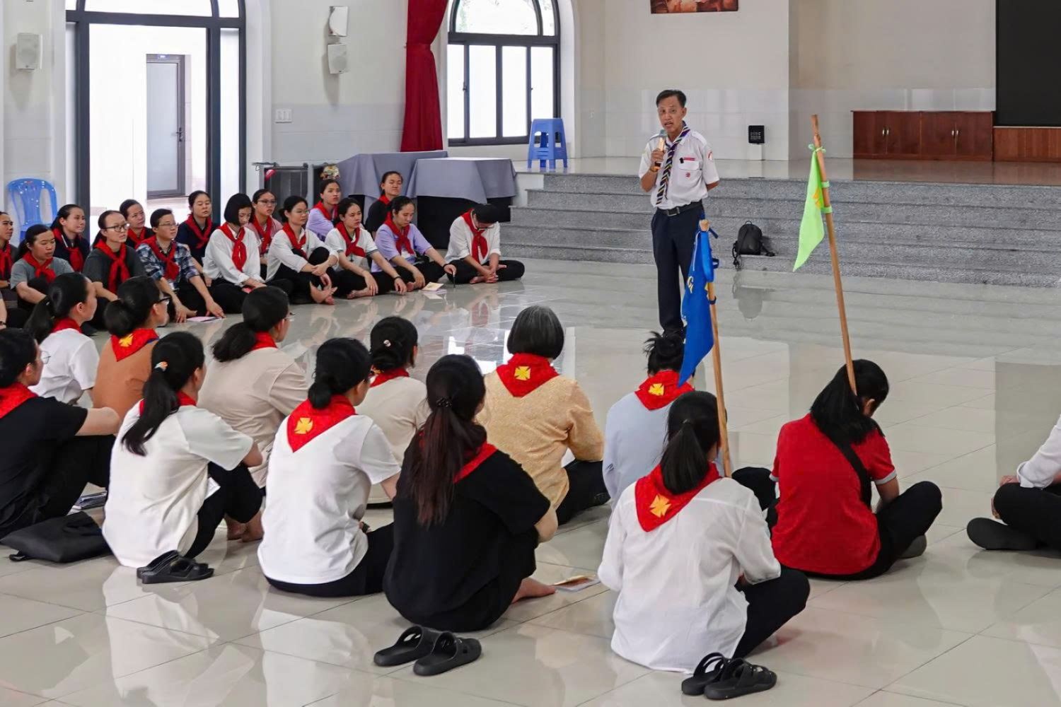 Sau khi làm phép khăn quàng, cha Tổng Tuyên úy và cha Giuse Ngô Vũ Anh Tuấn – Sa mạc trưởng, kiêm Tuyên úy sa mạc – trao khăn quàng cho các Trợ úy, để từ đây các Trợ úy chính thức cộng tác với các linh mục Tuyên úy trong các sinh hoạt TNTT.
