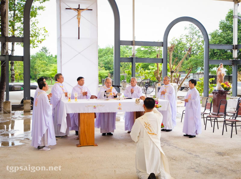 Nghi thức thánh hóa Ngôi Nhà Nguyện Trung tâm và Nhà Điều Hành vừa bắt đầu thì cơn mưa lớn lại trút xuống. Cộng đoàn không khỏi lo lắng khi nhìn Lm TĐD phải rất vất vả khi di chuyển sang Nhà Điều Hành để rảy nước thánh các phòng ốc.