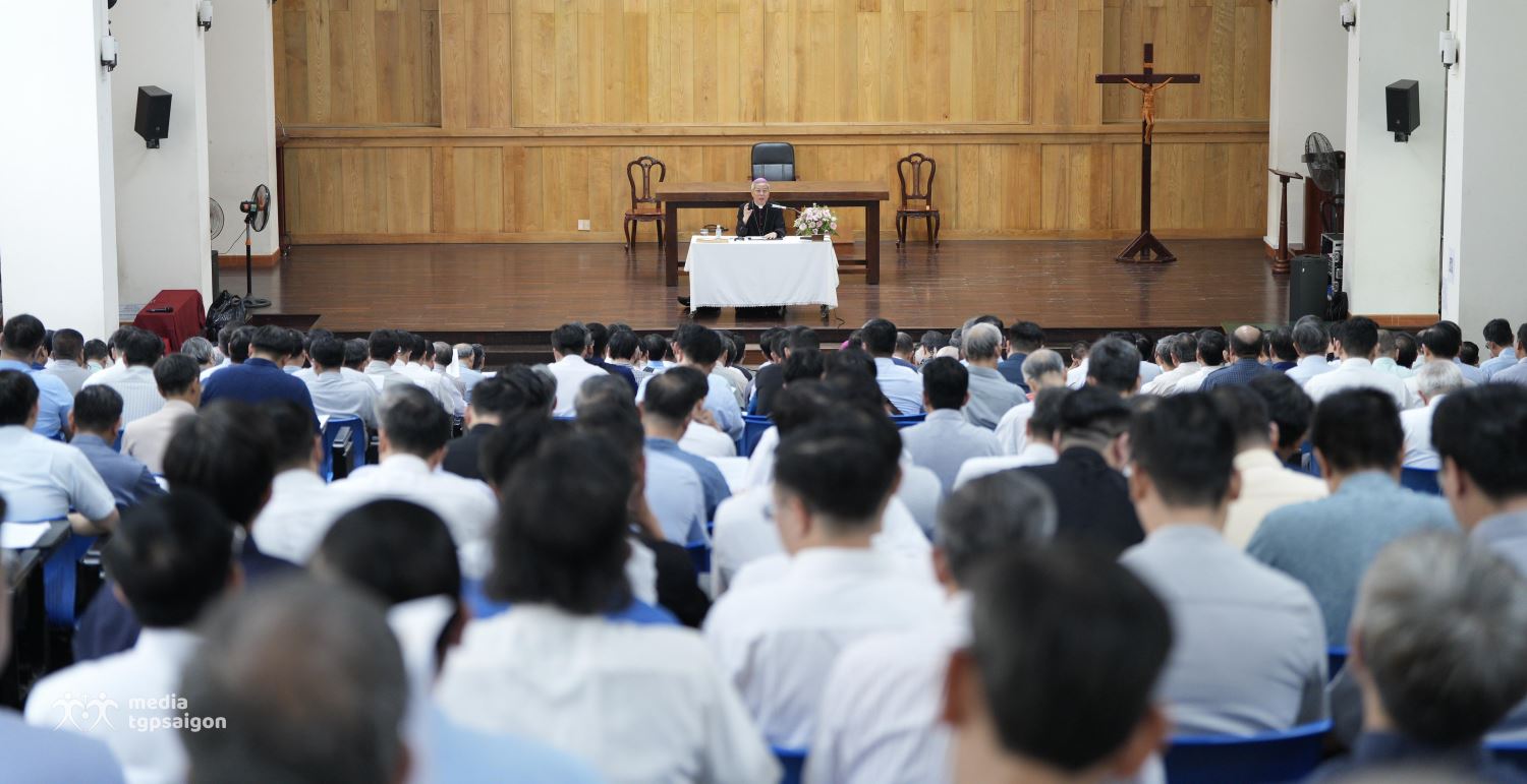 Sau khi suy niệm, cầu nguyện, xưng tội, chầu Thánh Thể và đọc Phụng vụ Giờ Kinh Trưa với nhau tại Đại chủng viện, các linh mục đã đi đến hội trường GB Phạm Minh Mẫn của Trung tâm Mục vụ TGP để lắng nghe Đức Tổng Giám mục Giuse nhắc nhở về: