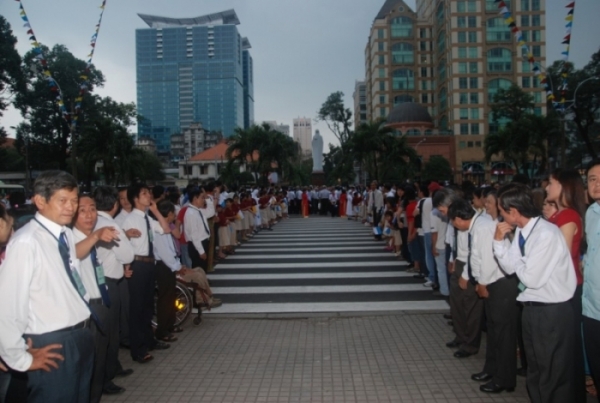 Lúc 04g30, đoàn xe du lịch 45 chỗ đưa chúng tôi đến chân tượng đài Nữ Vương Hòa bình, trước Vương cung Thánh đường Đức Bà Sài Gòn. Quang cảnh vui tươi, nhộn nhịp như chưa từng có. Từ trên hai chiếc tháp cao vút của ngôi Vương Cung Thánh Đường trải dài xuống biết bao cờ xí, đèn màu. Vui hơn nữa, hai bên chân tượng đài, ngoài các nữ tu còn có các em thiếu nhi xếp hàng đón chào trong đồng phục đỏ hồng, tay phất cờ liên tục không biết mỏi mừng đón đoàn đại biểu đến từ 26 Giáo phận, miệng cười tươi hơn hoa nơi công viên các em đứng. Thương làm sao những mầm non này: tương lai rực rỡ của Giáo hội, của Đất nước này!
