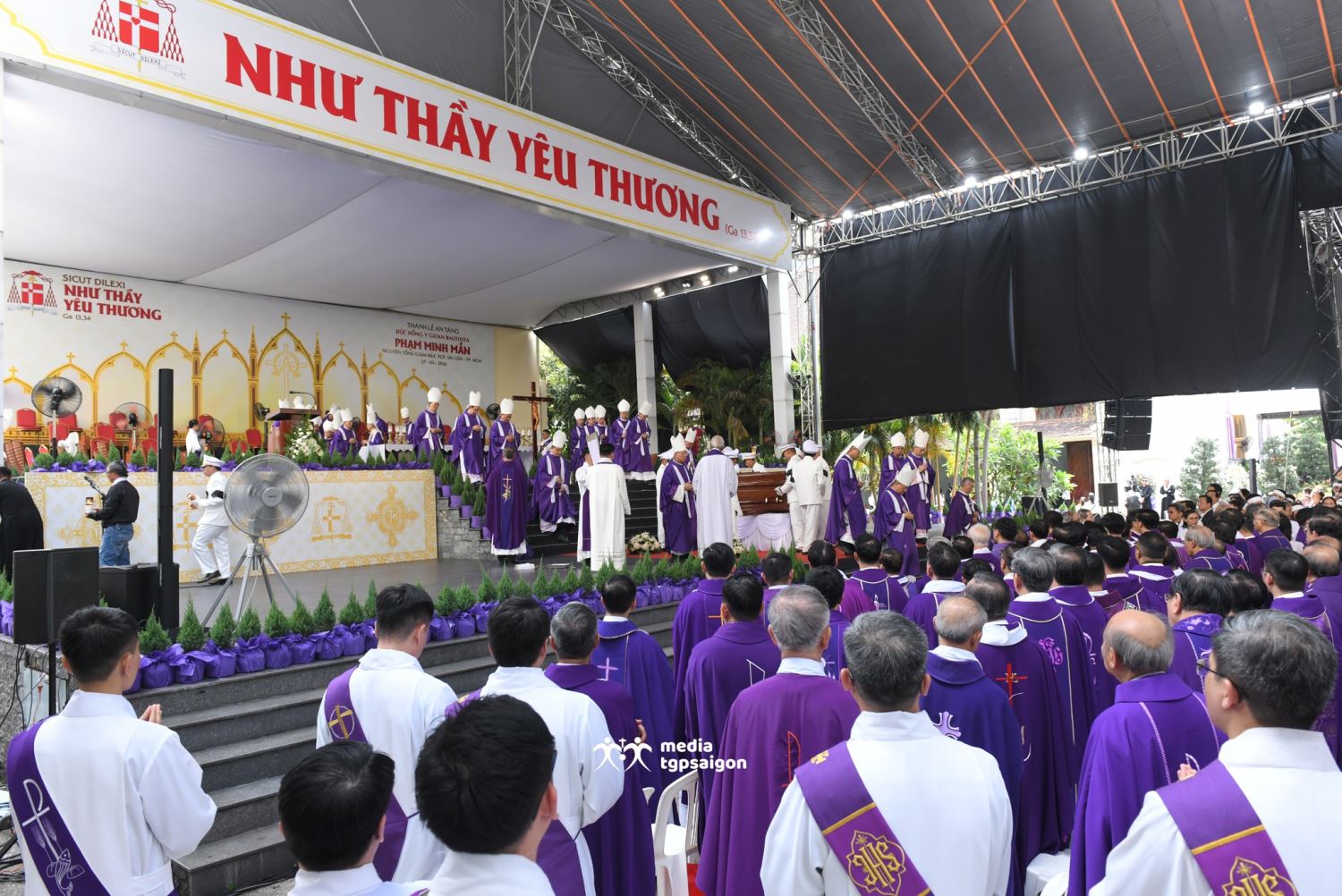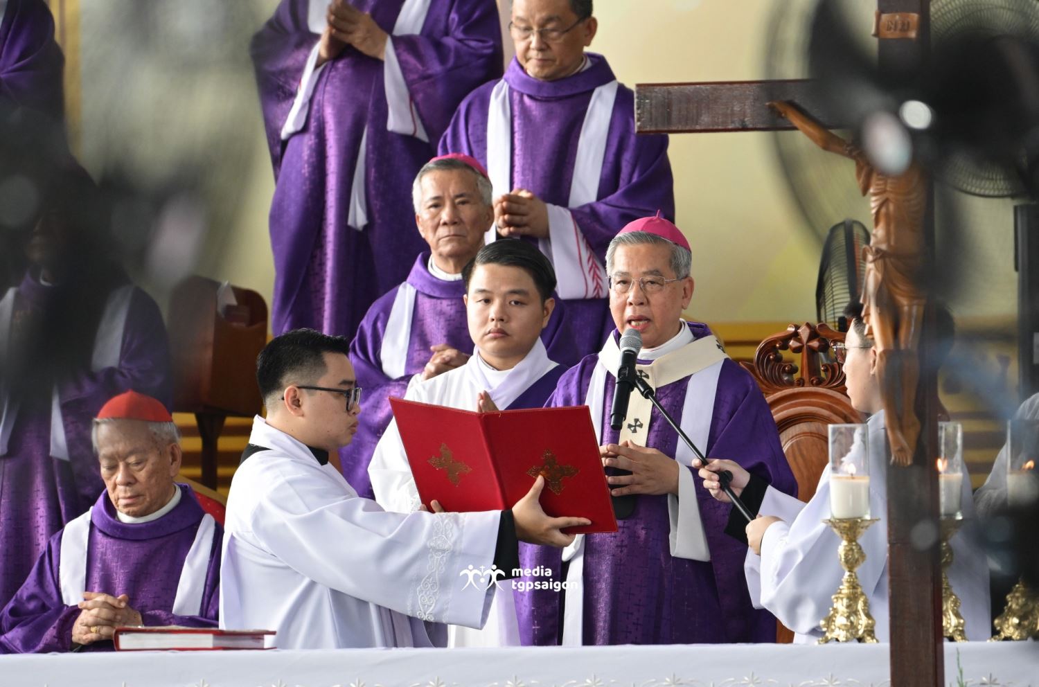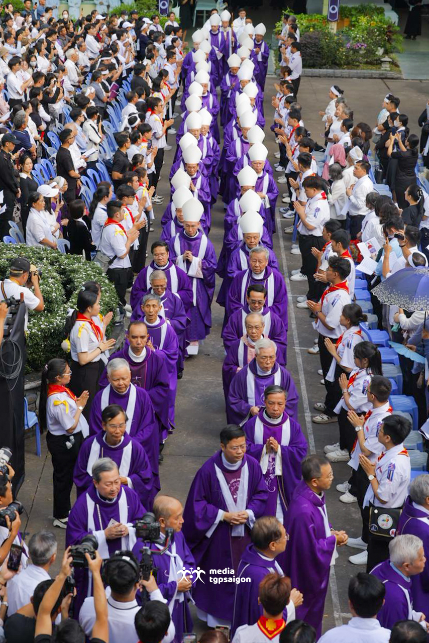 Sau khi linh mục Chưởng ấn Tòa Tổng Giám mục Sài Gòn đọc điện văn phân ưu của Đức Thánh Cha Lêô XIV, cộng đoàn phụng vụ đã lắng nghe lời chia buồn của Đức Tổng Giám mục Marek Zalewski - đại diện Tòa Thánh tại Việt Nam - và của Đức Tổng Giám mục Giuse Vũ Văn Thiên - đại diện HĐGM nói lời phân ưu với đại gia đình Tổng Giáo phận Sài Gòn.