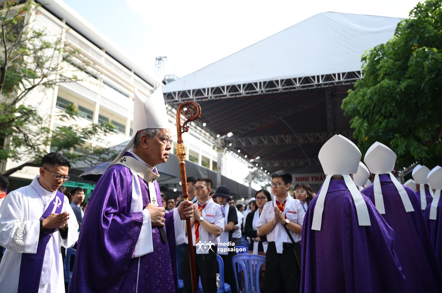 Lúc 8g20, đoàn rước đồng tế từ sân ngoài của Trung tâm Mục vụ tiến lên lễ đài.