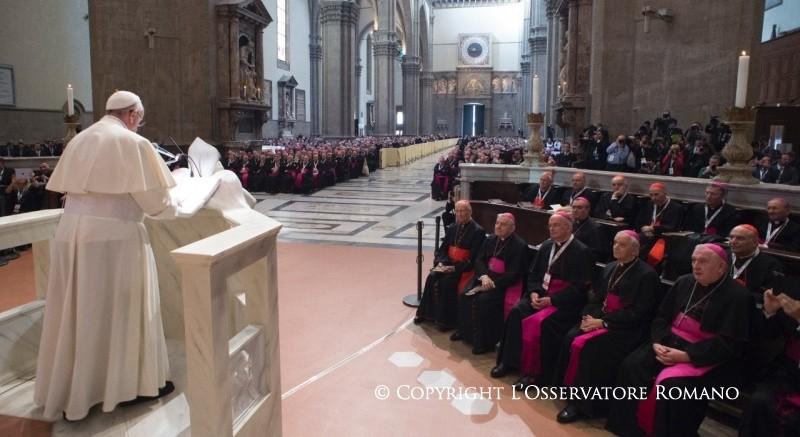 Tôi rất hài lòng với Giáo hội Ý, một Giáo hội không ngưng nghỉ nhưng luôn luôn đi đến gần hơn với những người bị bỏ rơi, bị quên lãng, những người tội lỗi. Tôi ao ước một Giáo hội hạnh phúc với gương mặt của một người mẹ, thấu hiểu, cảm thông và luôn ân cần chăm sóc. Anh chị em cũng hãy mơ về Giáo hội này, tin vào Giáo hội; canh tân với sự tự do. Với chủ thuyết nhân bản Kitô giáo, anh chị em được kêu gọi để sống xác tín một cách sâu sắc về nhân phẩm của mỗi người như là Con Thiên Chúa; nó thiết lập giữa những con người với nhau một tình anh em căn bản, nó dạy chúng ta hiểu rõ về công việc, sống với công trình tạo dựng như là ngôi nhà chung, nó nuôi dưỡng lý trí, niềm vui và hài hước ở giữa cuộc đời, vốn dĩ là điều khó khăn.