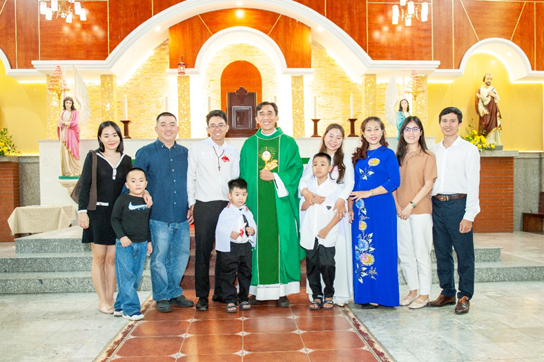 Niềm hân hoan của gia đình trẻ trong buổi chiều đặc biệt này khó có thể diễn tả trọn vẹn. Niềm vui ấy cũng hiện rõ nơi cha phó Gioan Baotixita Trần Phước Lộc, người trực tiếp phụ trách lớp giáo lý và đồng hành với đôi vợ chồng trẻ cùng các anh chị em khác. Trong cuộc trò chuyện ngắn sau thánh lễ, dù anh chị ít nói và không giỏi diễn đạt, nhưng nơi ánh mắt của họ vẫn toát lên sự tin tưởng và phó thác vào tình yêu của Thiên Chúa.