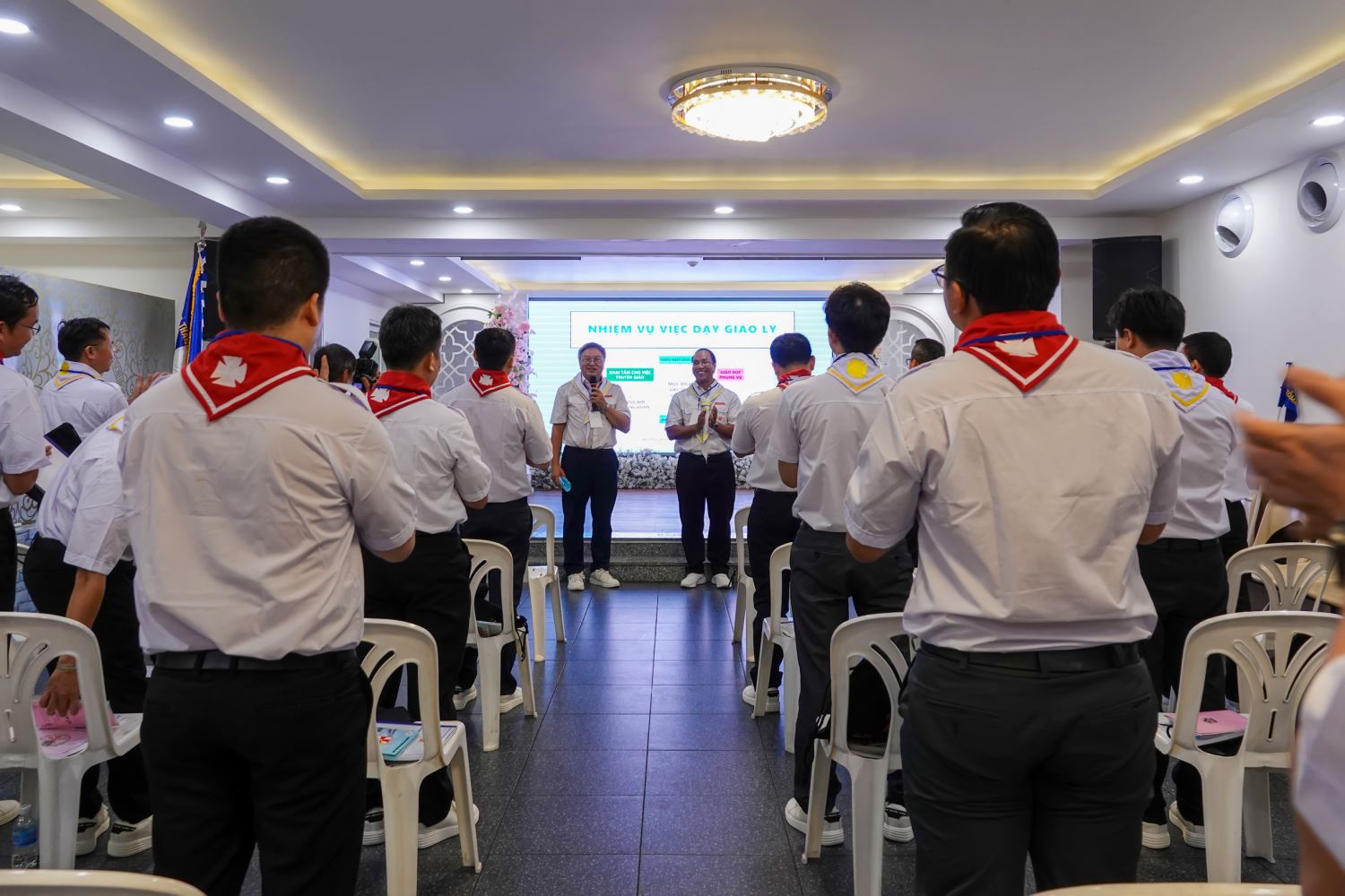 Tiếp đến, ĐGM làm phép khăn quàng TU. Khăn màu trắng viền vàng nói lên sự thanh sạch, lòng đạo đức sốt mến, đức khiêm nhường và tinh thần dấn thân cao độ của người TU-TNTT. Trước khi trao khăn, ngài tuyên bố “Tôi trao khăn cho các TU để các TU chính thức hướng dẫn Đoàn TNTT trong các sinh hoạt của TNTT-VN, cho các thanh thiếu niên”.