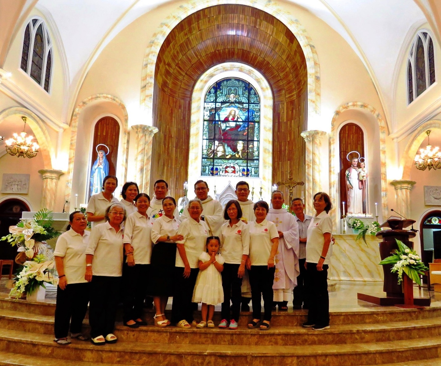 Thánh lễ kết thúc lúc 19 giờ, anh chị em Ban Caritas cùng chụp hình lưu niệm với bốn cha đồng tế và ra đài thánh Martinô để cùng đọc kinh kính thánh nhân.