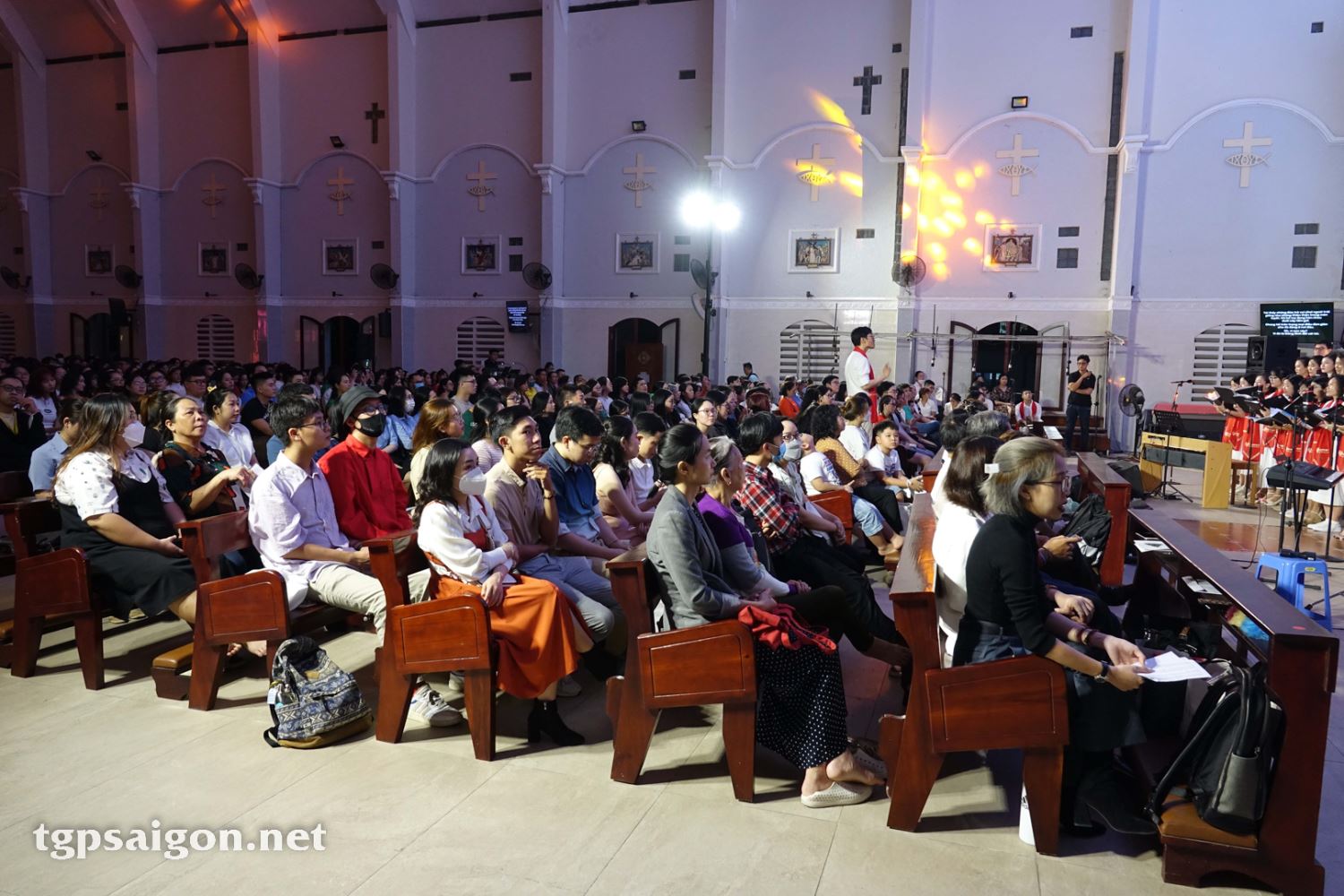 Năm nay, chương trình được thiết kế khác với mọi năm. Sau lời khai mạc của linh mục Chánh xứ Phêrô Lê Văn Chính, các thành viên của ca đoàn với trang phục toàn trắng, khăn choàng Lumen đỏ, đã lần lượt cùng nhau, từng nhóm nhỏ, tiến lên Cung thánh.