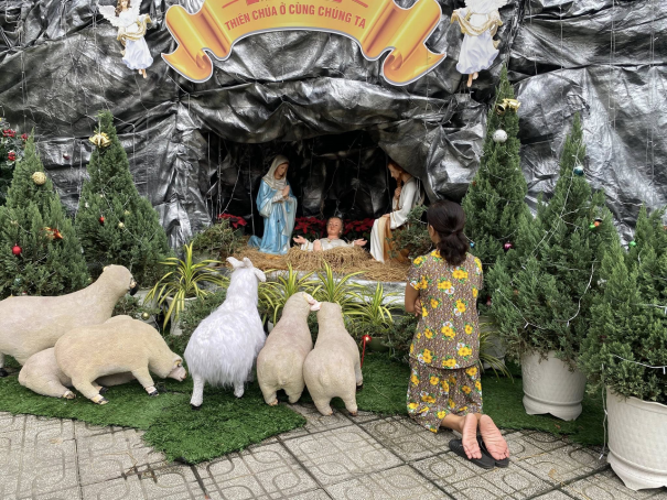 Hôm nay chúng tôi găp những hình ảnh rất đẹp: Có những người quỳ cầu nguyện bên hang đá tại sân nhà thờ. Chắc hẳn họ đang gửi lên Chúa Hài Đồng những khó khăn, bất trắc trong cuộc sống.